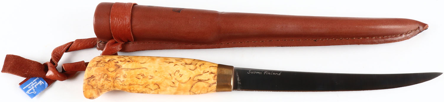Foreign fishing fixed blade knife, Suomi Finland,, 6'' blade, has leather sheath, all bright and clean. Grade: Excellent ++ - Value: 6 to 60