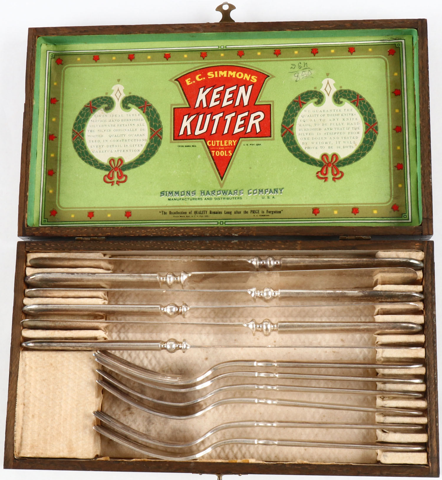 RARE! E.C. Simmons Keen Kutter knife and fork set, 6 of each, in beautiful wood box. Grade: Excellent - Value: 30 to 90