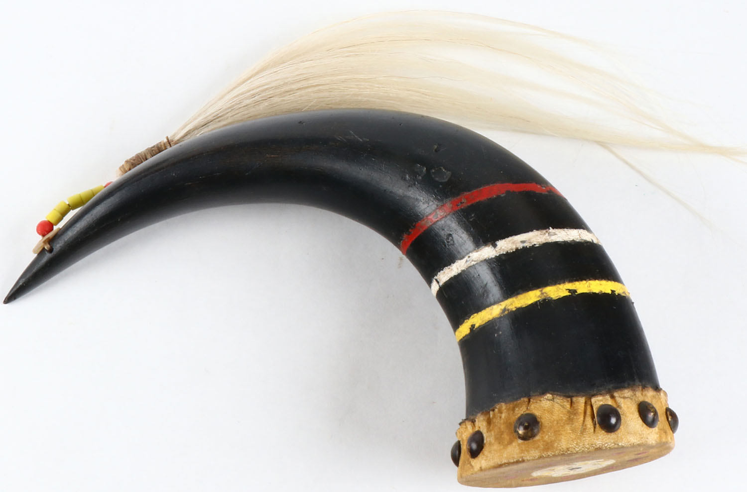 RARE Crow Medicine Man Buffalo Horn Rattle, circa 1860, buffalo hide cap with brass tacks, horse hair drop, trade beads, sinew and ocher paint. Grade: Excellent - Value: 25 to 600