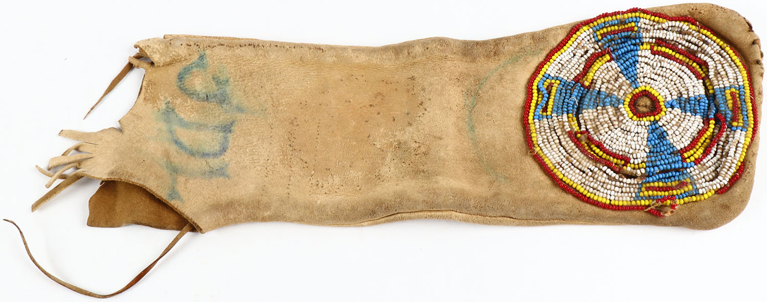 Antique leather pouch with beads, has age soiling. Grade: Very Good - Value: 20 to 100
