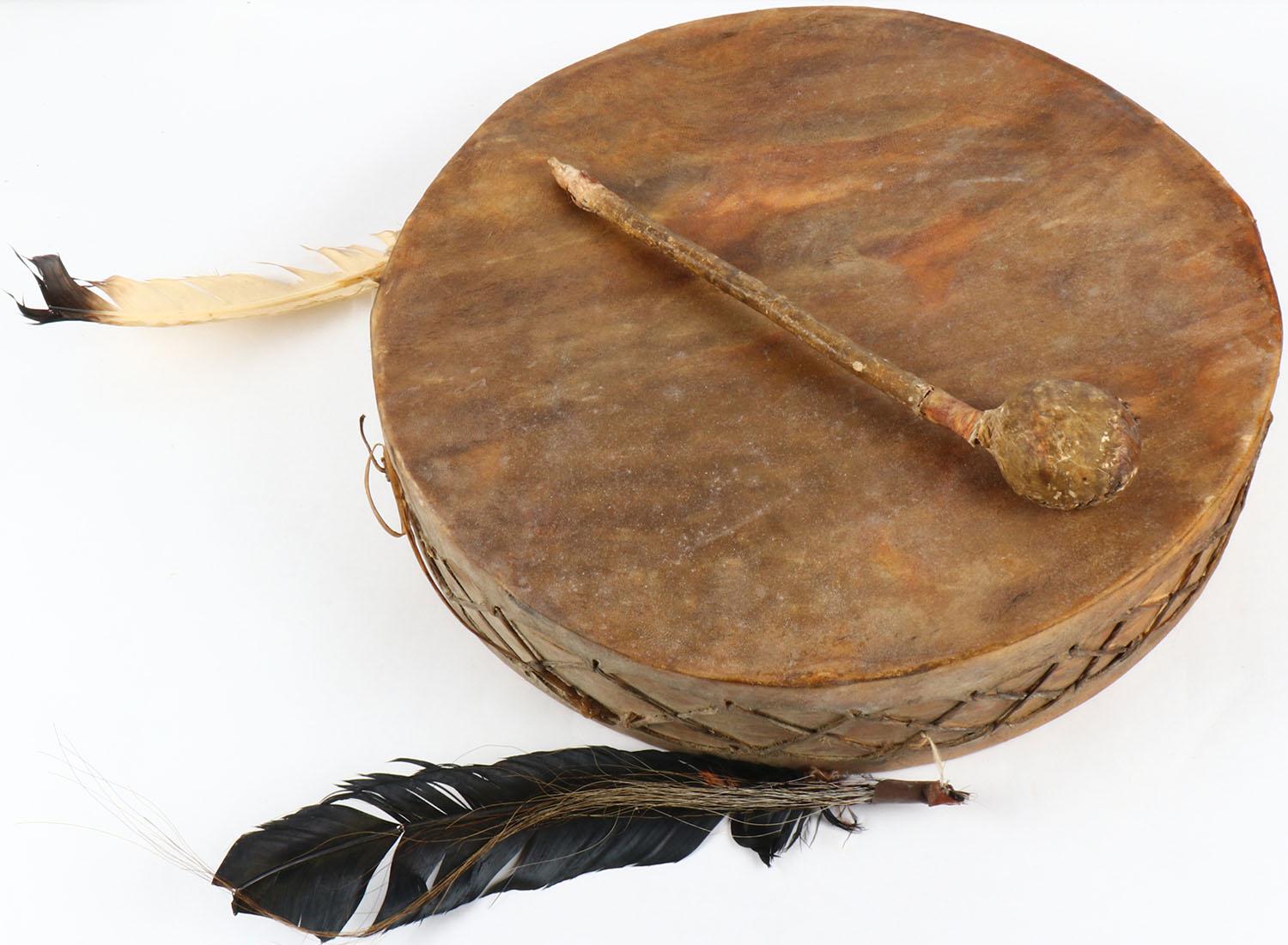 Antique Native American wood and leather drum with feathers, show scuffing/wear all over, 16'' x 16'' x 4'', with drumstick, made with wood. Leather and a stone on the end, tip is near broken off. Grade: Very Good - Value: 50 to 300