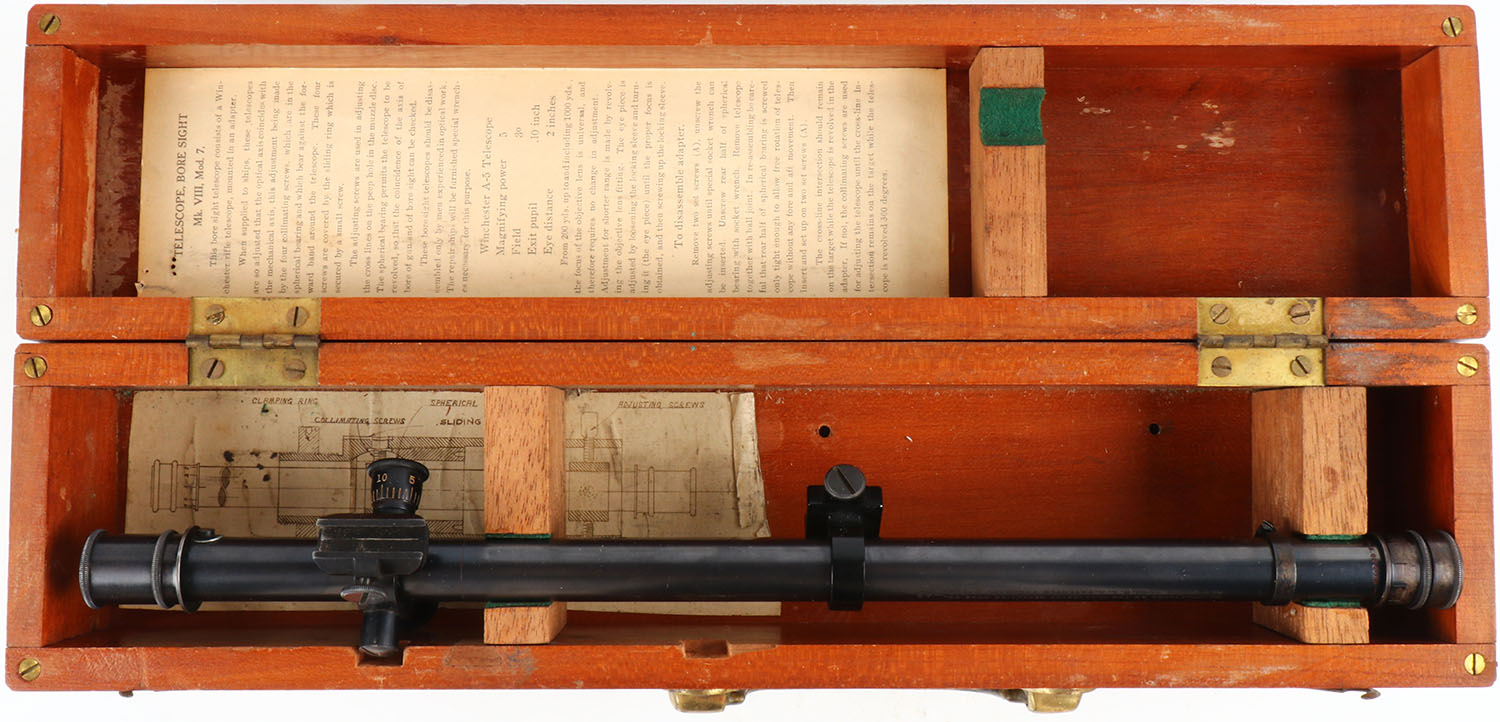 RARE! Winchester A5 rifle scope, Mk. VIII Mod 7, crosshair reticle, in orginal box, detailed information about taking care of the scope and other info and a detailed diagram of how it was made. Grade: Excellent - Value: 400 to 800