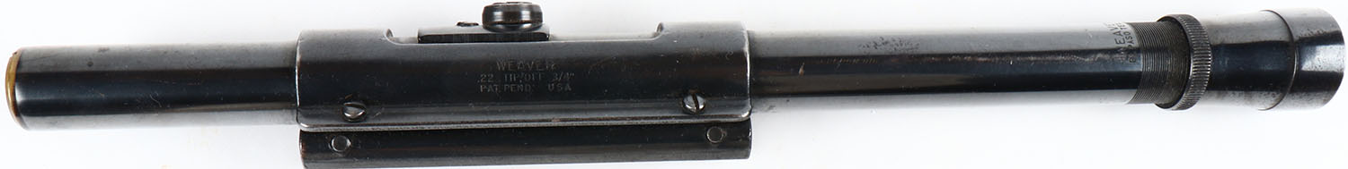 RARE! Weaver 3/4'' Rifle scope, Model B4, 4 power, fine crosshair reticle, 2'' eye relief, with exposed collard windage & elevation screws. Grade: Excellent - Value: 10 to 60