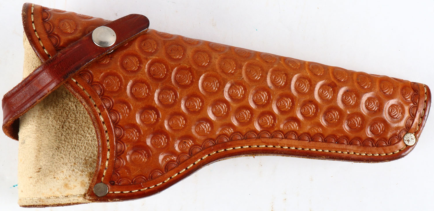 Custom leather holster with suede interior lining, has roses stamped tooling. Grade: Excellent - Value: 10 to 150