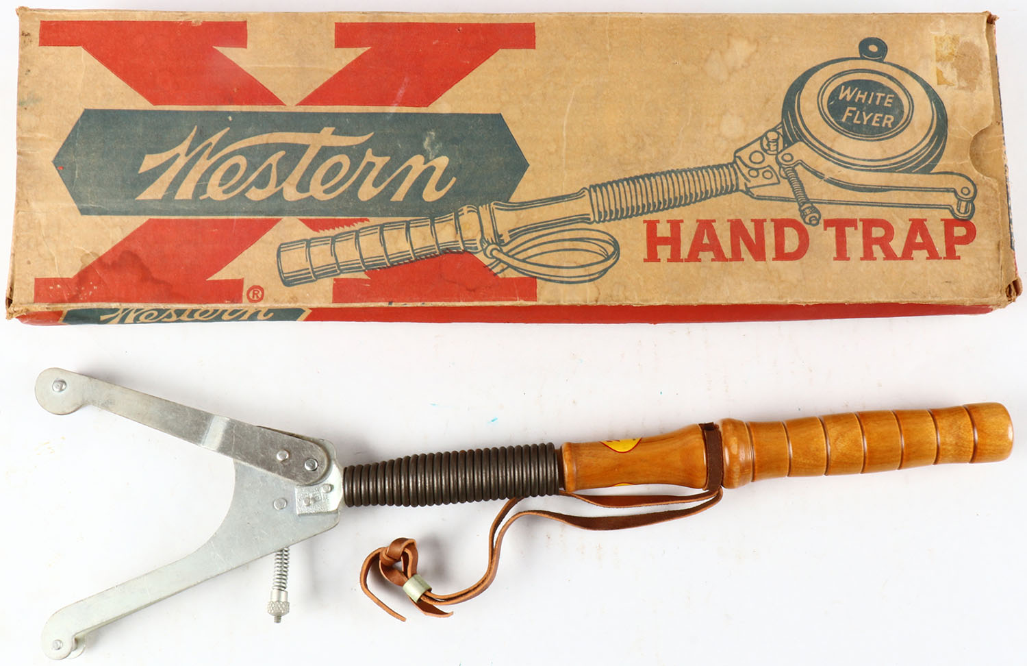 Western hand trap thrower, in box. Grade; Very Good + - Value: 10 to 40