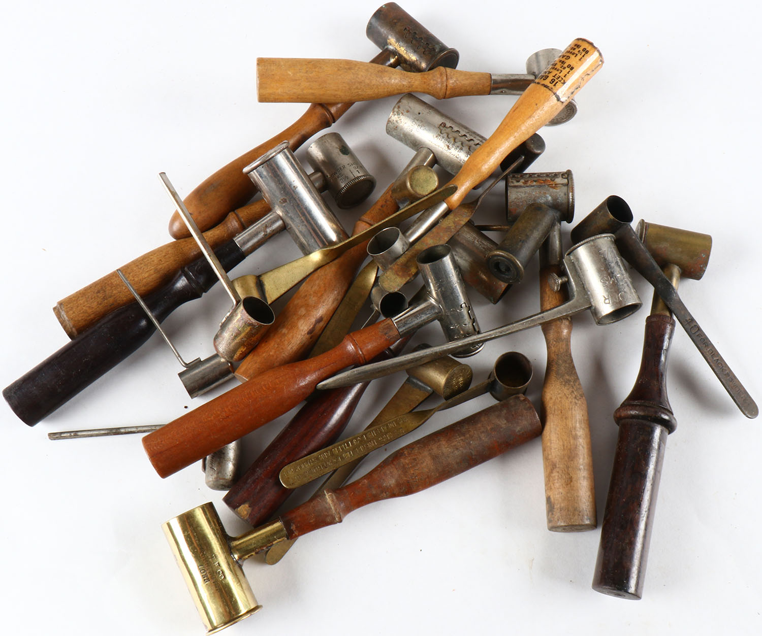 Large lot of powder measurers, various manfs- BGI, Cape Well & Sons, US smokeless powder Co., UH CO and others. Grade: Very Good - Value: 50 to 500