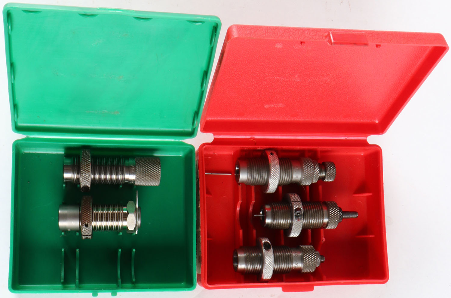 Lot of 2 Bonanza/RCBS reloading dies, carbide die set 9mm luger, 45 ACP, in original box. Grade: Excellent - Value: 16 to 60