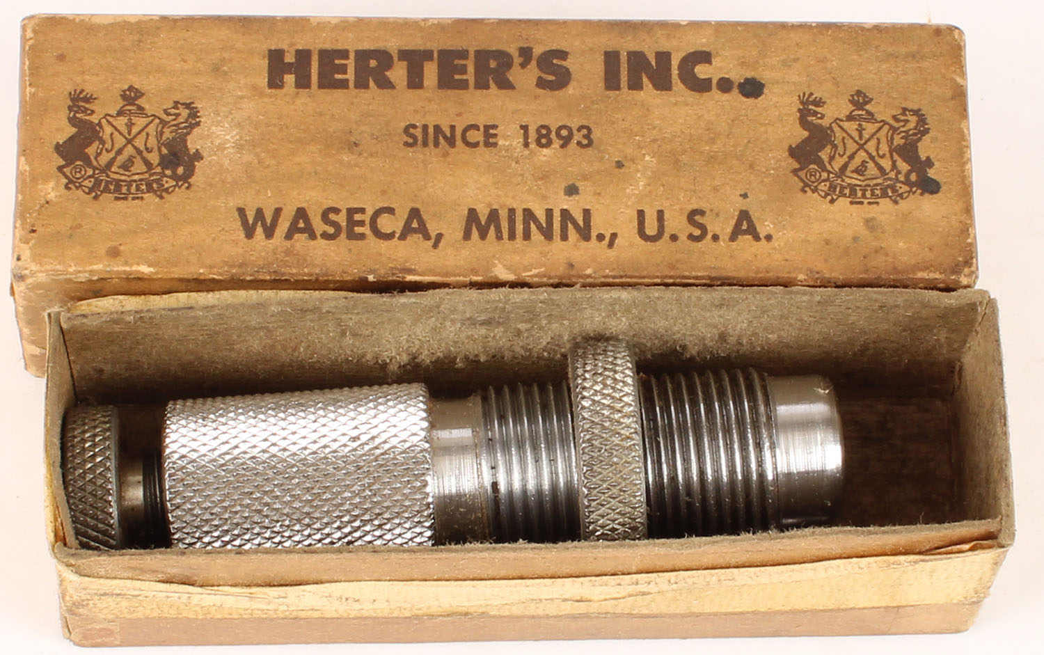 Herter's Reloading Die in original box, unknown caliber, box is solid with good color, age soiling, minor edge & corner wear, Die is rust-free and functions properly, comes only with what is pictured. Grade: Excellent + - Value: 10 to 50