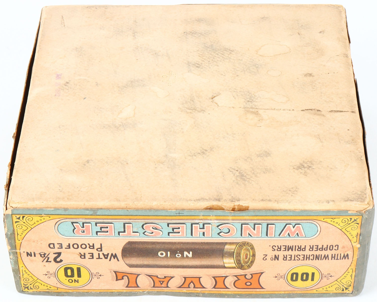 Winchester Rival 100ct. Christmas Box, EXTREMELY RARE, 10ga, 2pc., 85% Partial of NPE, 2 7/8'', multi colored box with hunter and two dogs on top label, box has light soiling, light edge wear, some tears, & box has been professionally touched up on edges, Shells are good. Grade: Very Good ++ - Value: 8000 to 20000
