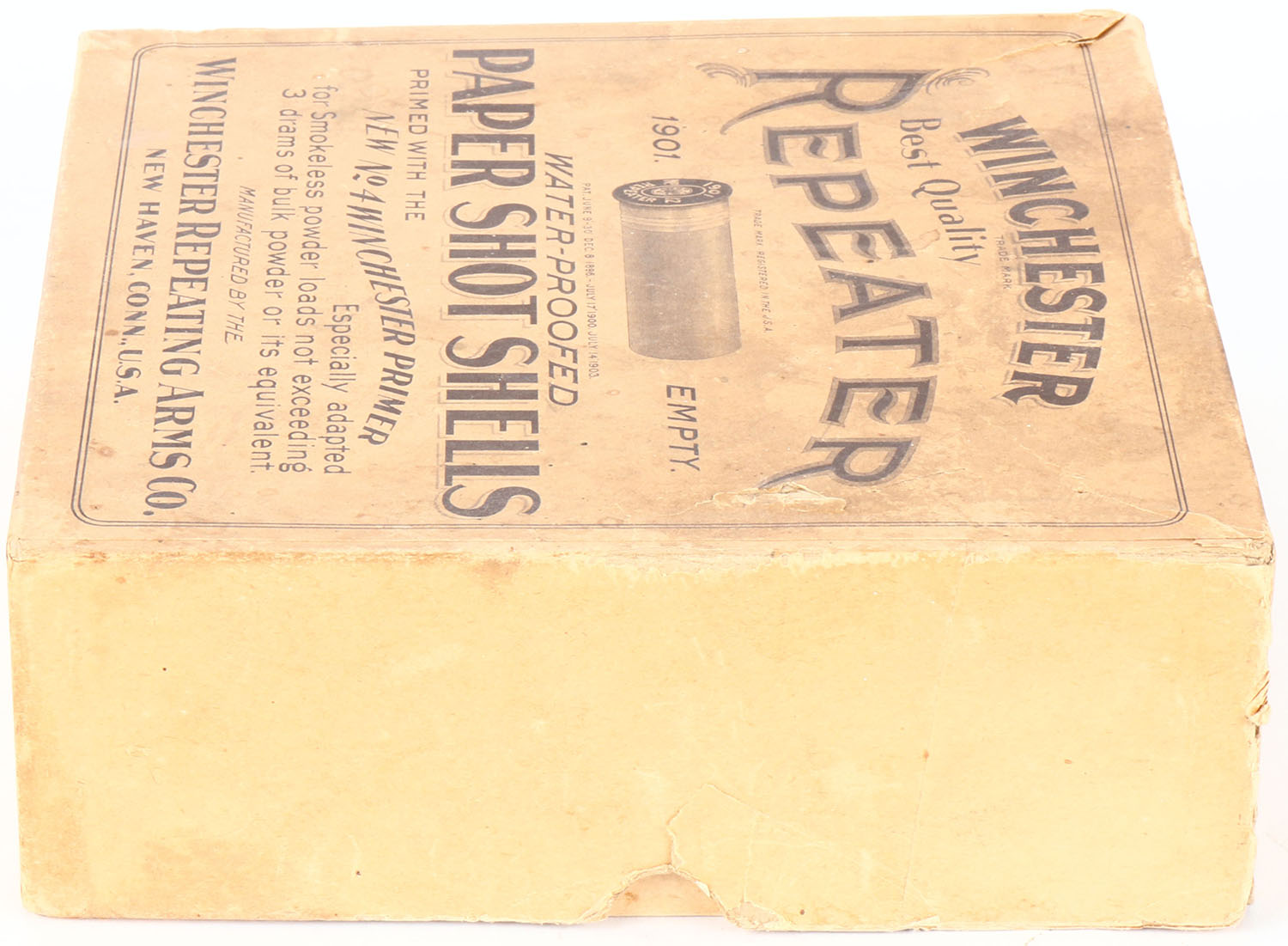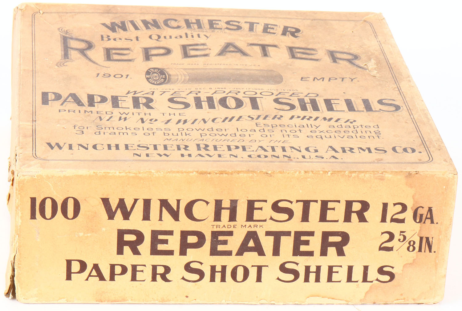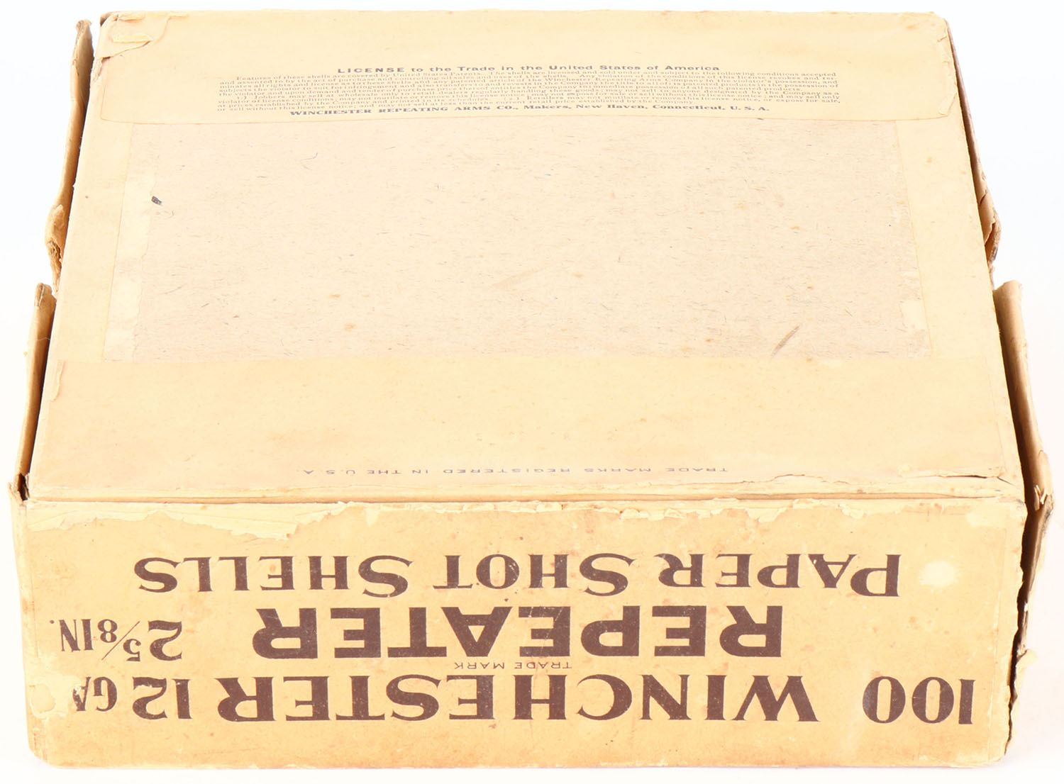 Winchester, Repeater, NPE, 12ga, 2pc., Empty, 2 5/8'', buff box with buff and black label, box has light edge wear, seam splits and soiling. Grade: Very Good ++ - Value: 100 to 500