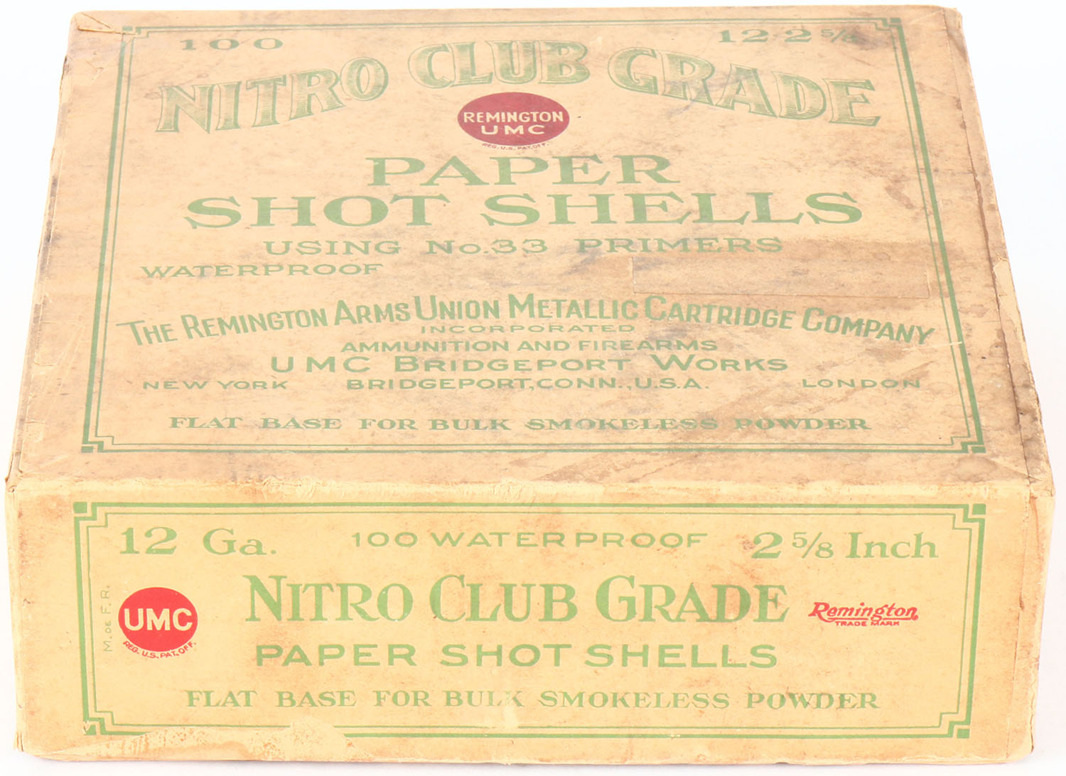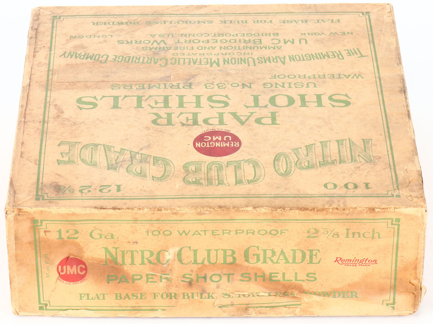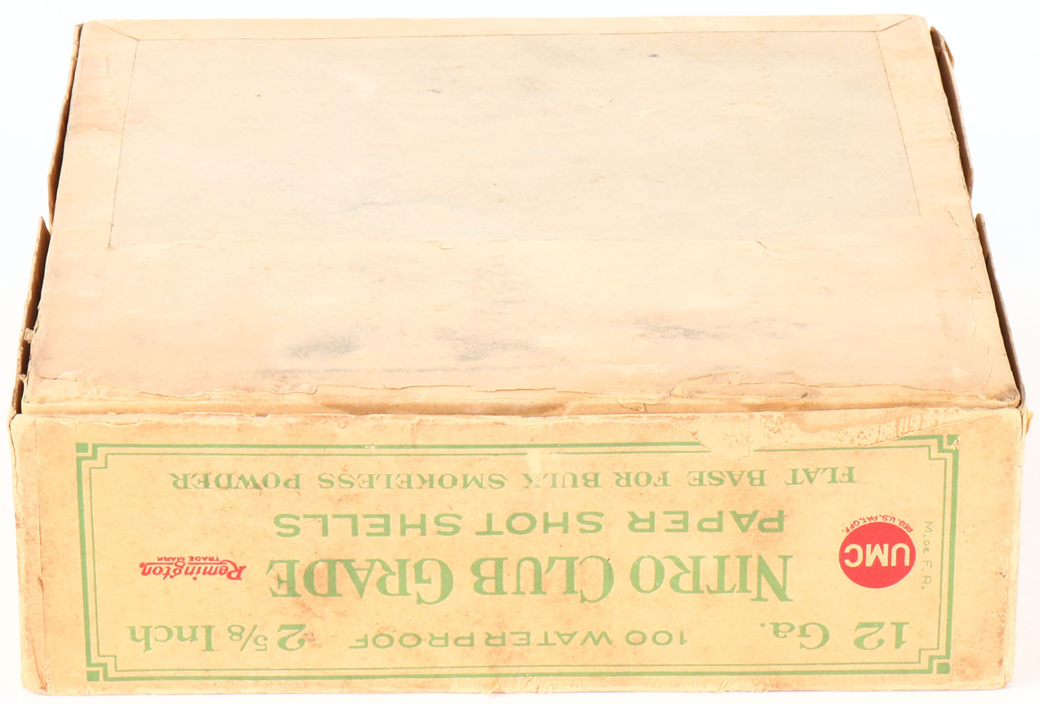 Remington UMC, NITRO CLUB GRADE, NPE, 12ga, 2pc., FULL, 2 5/8'', buff box with green and buff label, label is 90% intact with age soiling & light scuffing, Shells are very good. Grade: Very Good ++ - Value: 100 to 500