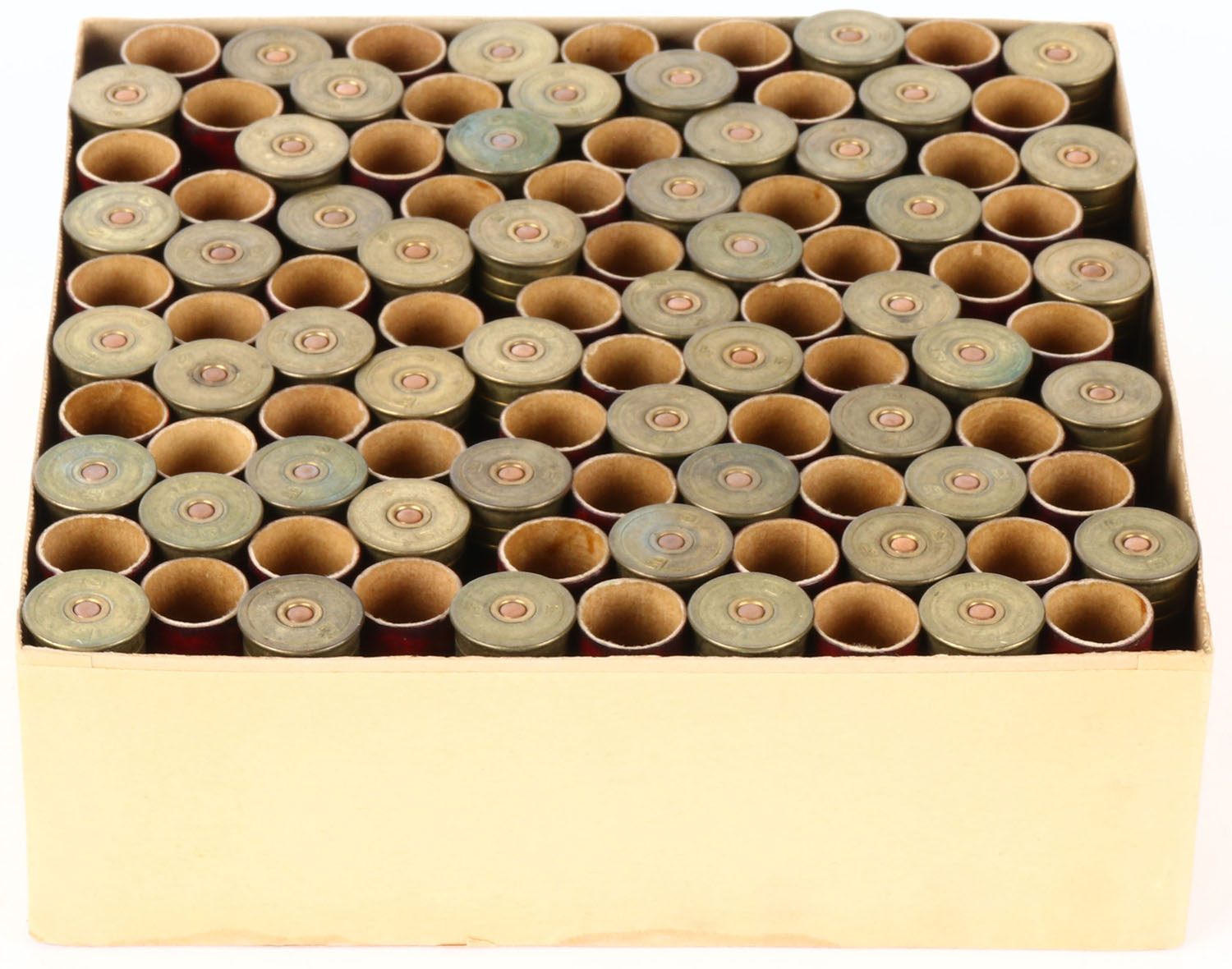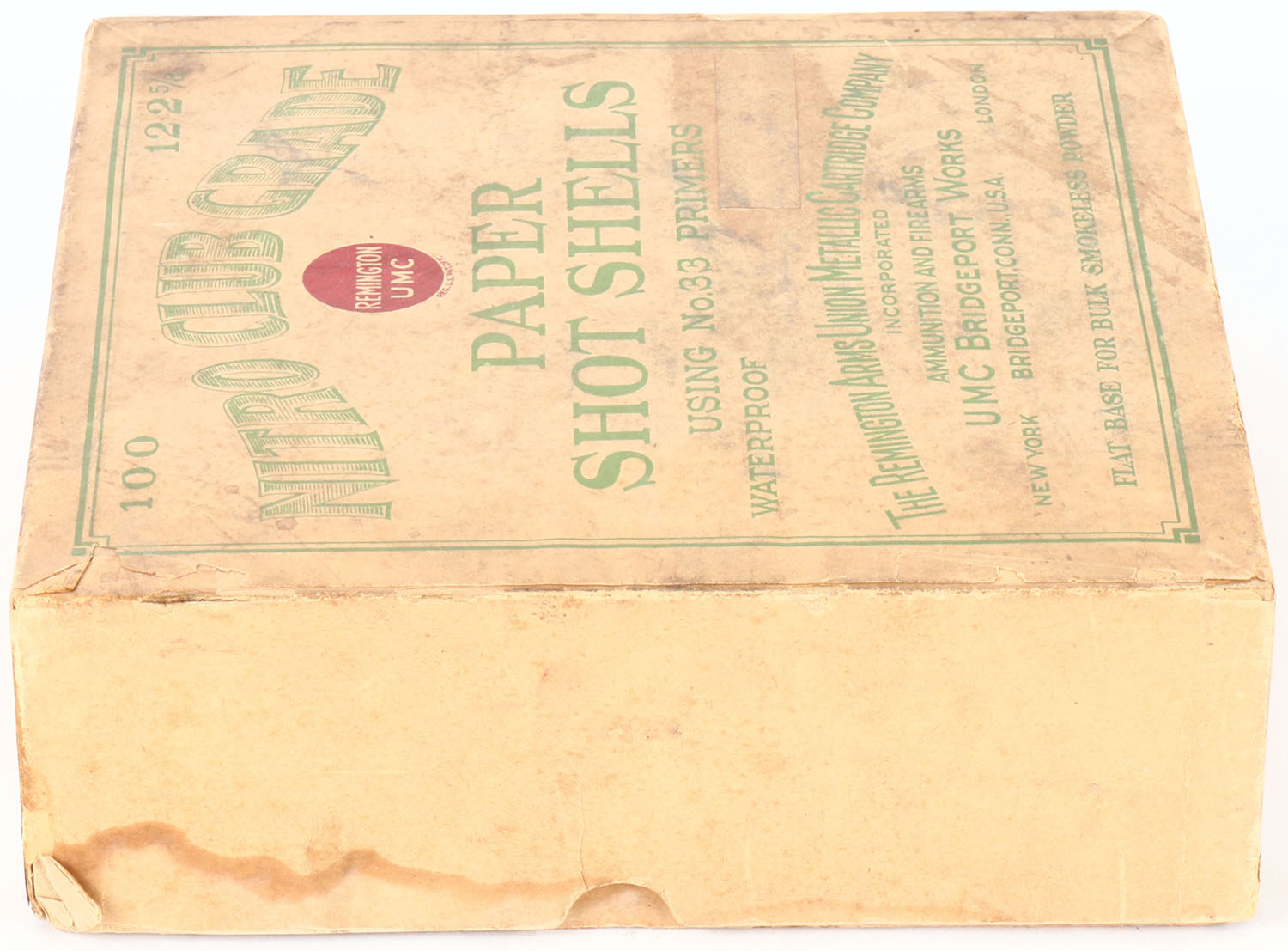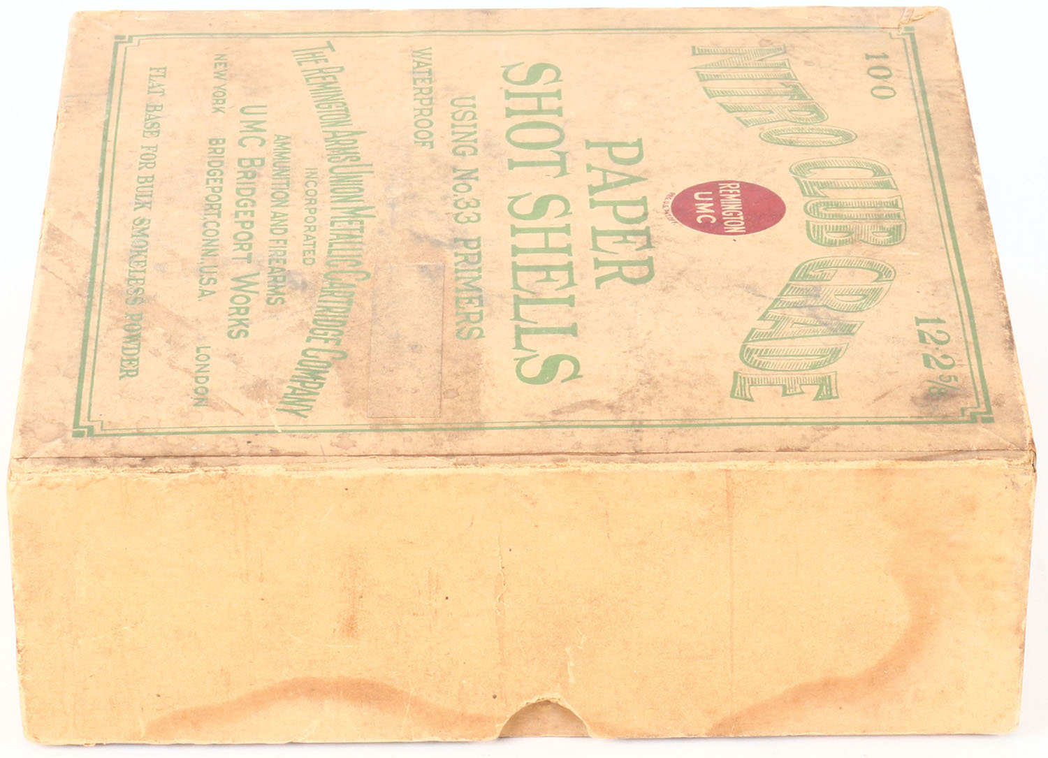 Remington UMC, NITRO CLUB GRADE, NPE, 12ga, 2pc., FULL, 2 5/8'', buff box with green and buff label, label is 90% intact with age soiling & light scuffing, Shells are very good. Grade: Very Good ++ - Value: 100 to 500