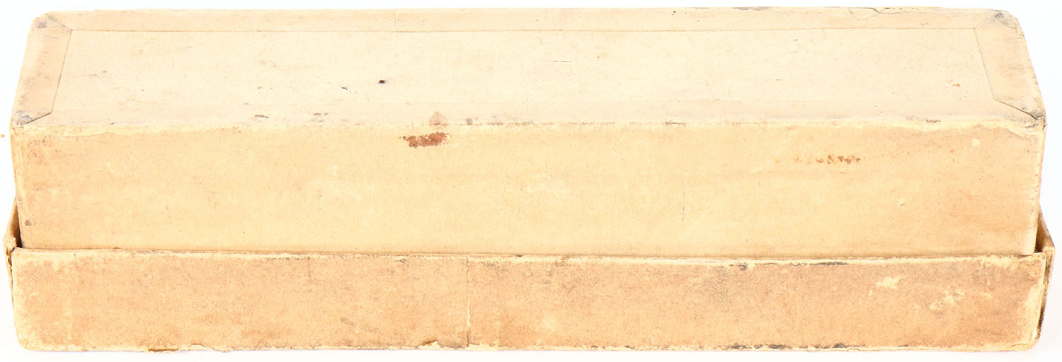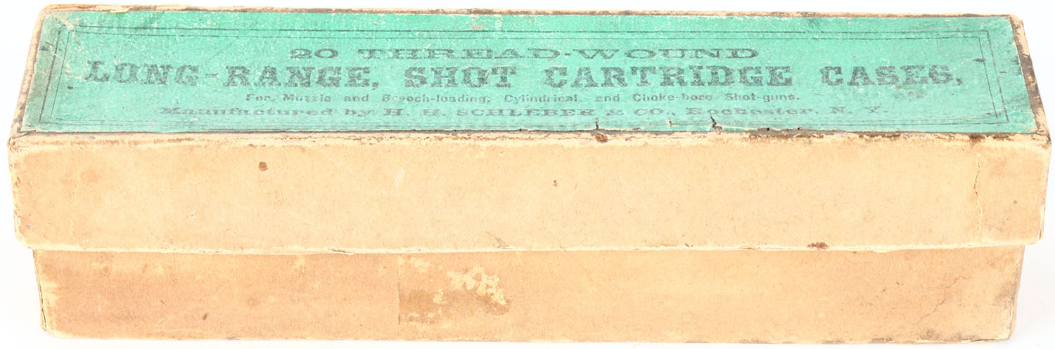 H.H. Schleber & Co., 20 Thread-Wound, Long-Range Shot Cartridges Cases, 12ga, 2pc., 6rds, shot size unknown, buff box with black & green label, box has seam splits, age soiling, light edge wear & nice colors. Grade: Very Good ++ - Value: 100 to 300