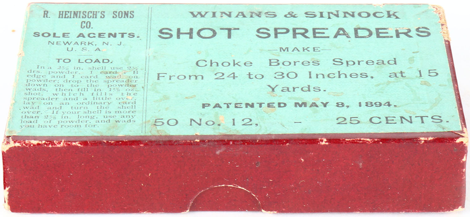 R. Heinisch's Sons Co., Winans & Sinnock, Shot Spreaders, 12ga, 2pc., Partial 22 shot spreaders, Choke Bores Spread From 24 to 30 inches at 15 Yards, red box with green & black label, box has edge wear, light soiling, & great colors. Grade: Very Good ++ - Value: 40 to 80