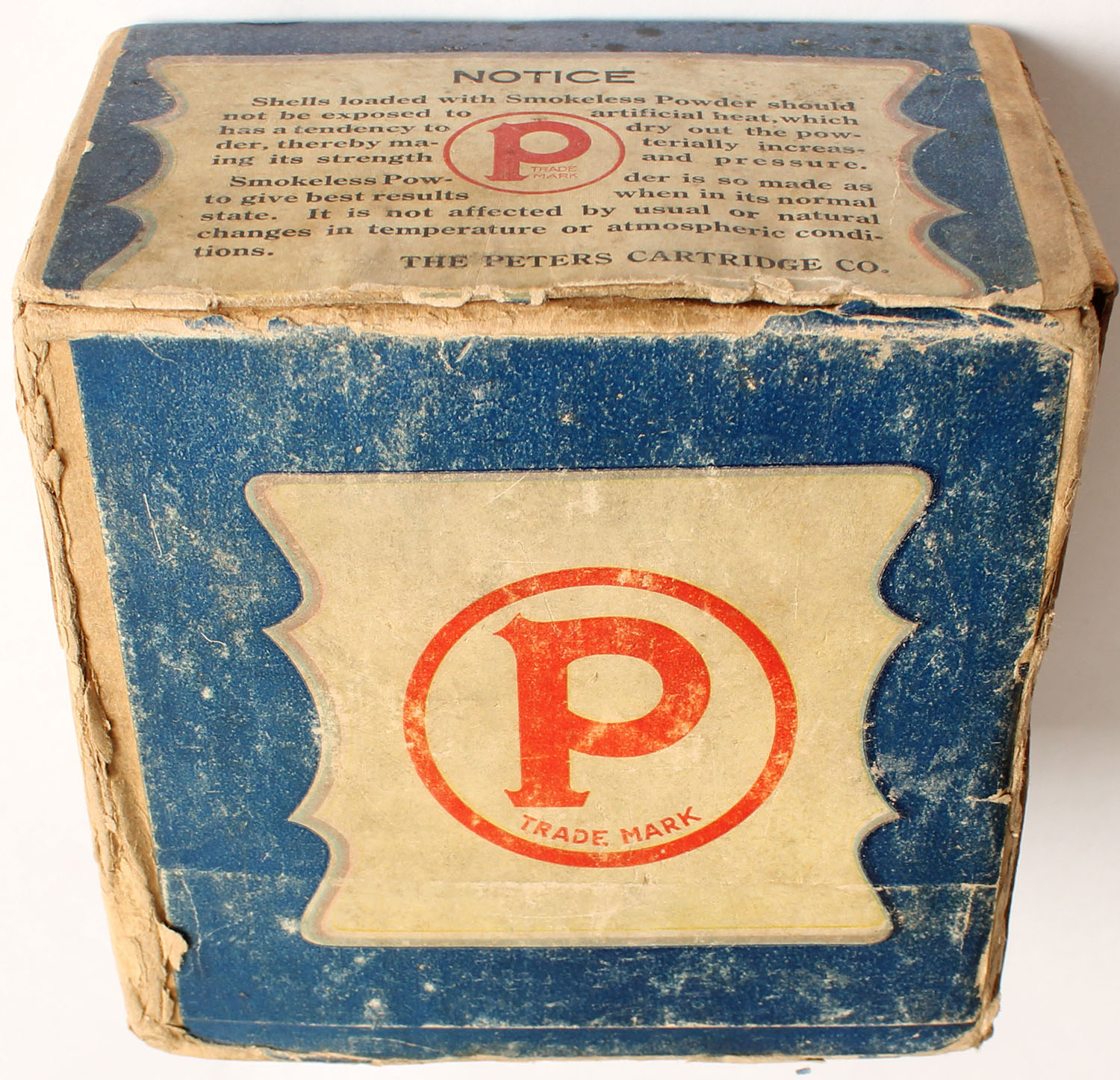 RARE! Peters Cart. Co., HIGH GUN, 10ga, 2pc., Empty, shot size 4 Buck Shot, buff box with multi colored picture of Snipe, Loading: No. L. 1024, 32 Grs., 1 1/4Oz. 4 Buck Shot, Infallible Smokeless, box has light soiling with edge wear and tape repair, label is very good with light scuffing. Grade: Very Good ++ - Value: 500 to 1000