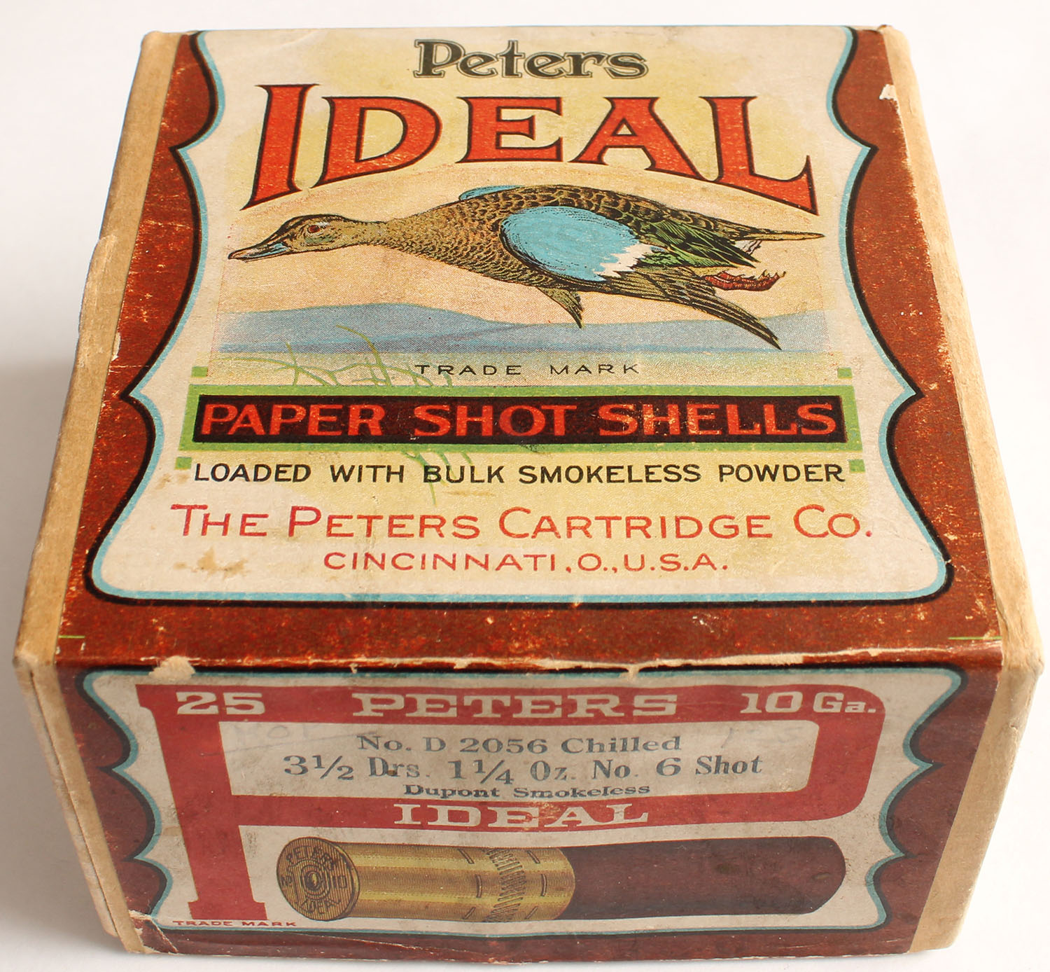 Peters Cart. Co., IDEAL, Blue Wing Teal, 10ga., 2pc., Empty, shot size 6, buff box with multi colored label that pictures Blue Wing Teal in flight, box has light edge wear & light age soiling with very good label & very nice colors. Grade: Excellent - Value: 200 to 600