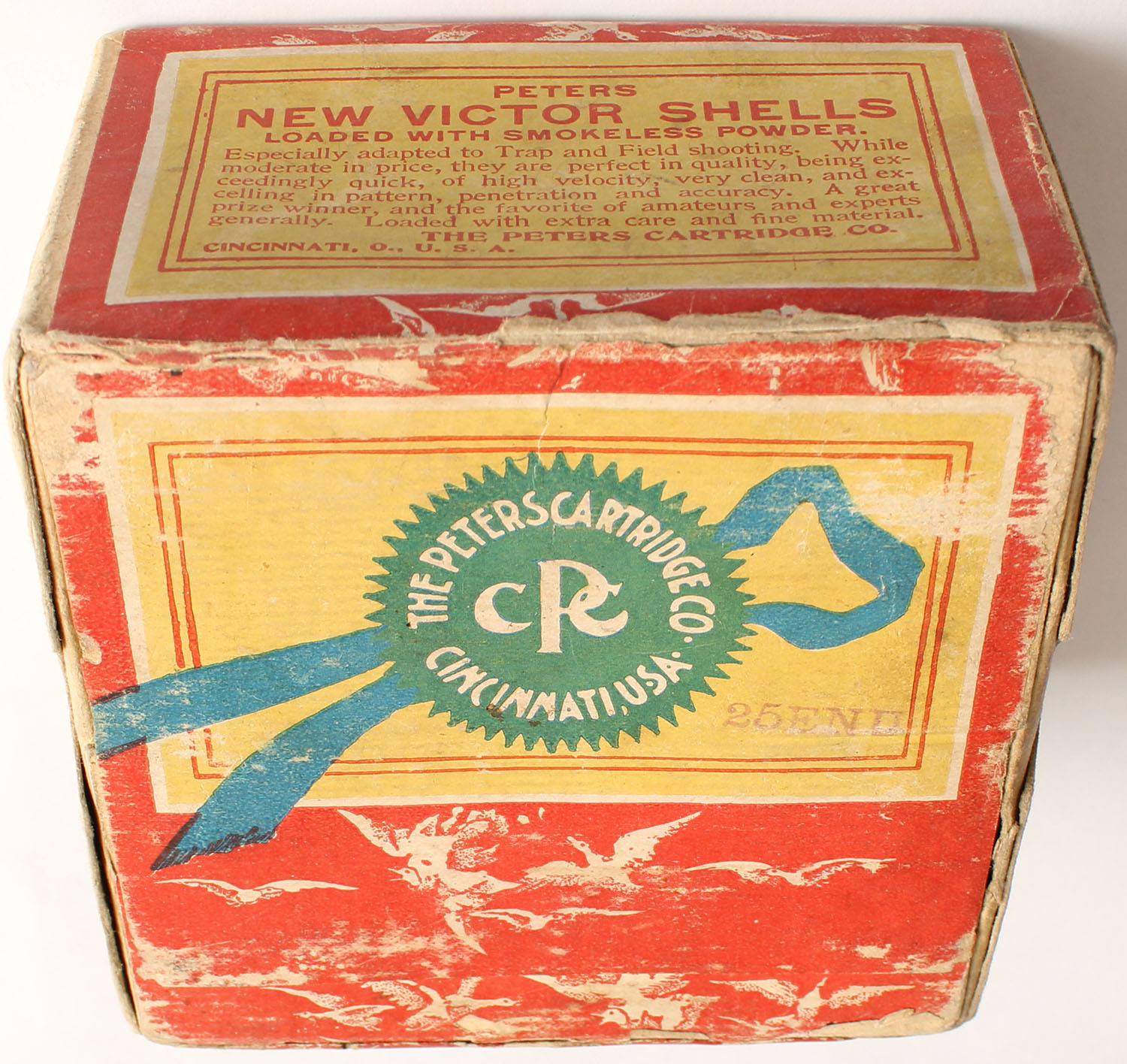 Peters Cart. Co., New Victor, 12ga., 2pc., Empty, shot size 6 shot, buff box with multi-colored label, Loading: No. 36, 3 Drs., 1 1/8 Oz. No. 6 Shot, Smokeless Powder, box has very nice label with bottom label being correct & being 100% intact, box has light age soiling & light scuffing. Grade: Very Good ++ - Value: 800 to 2000
