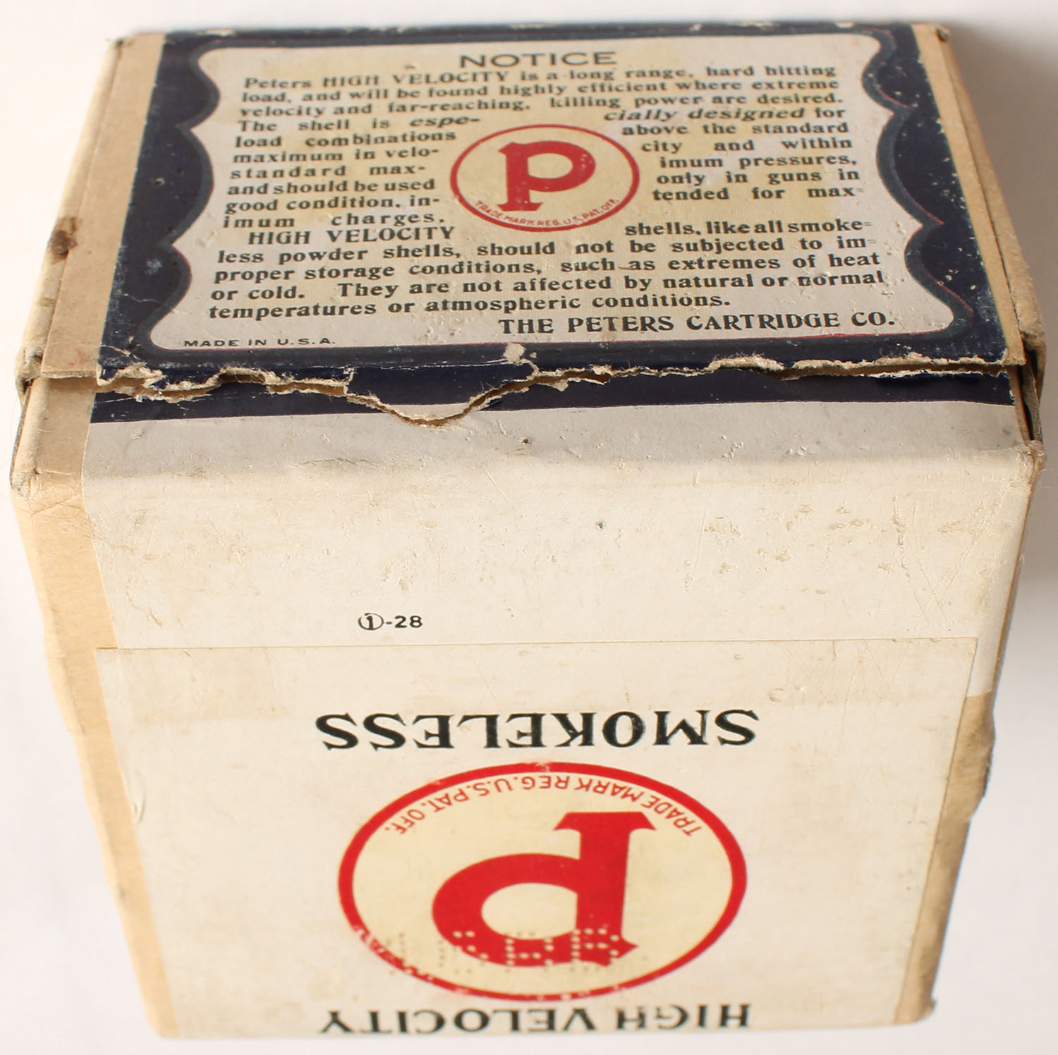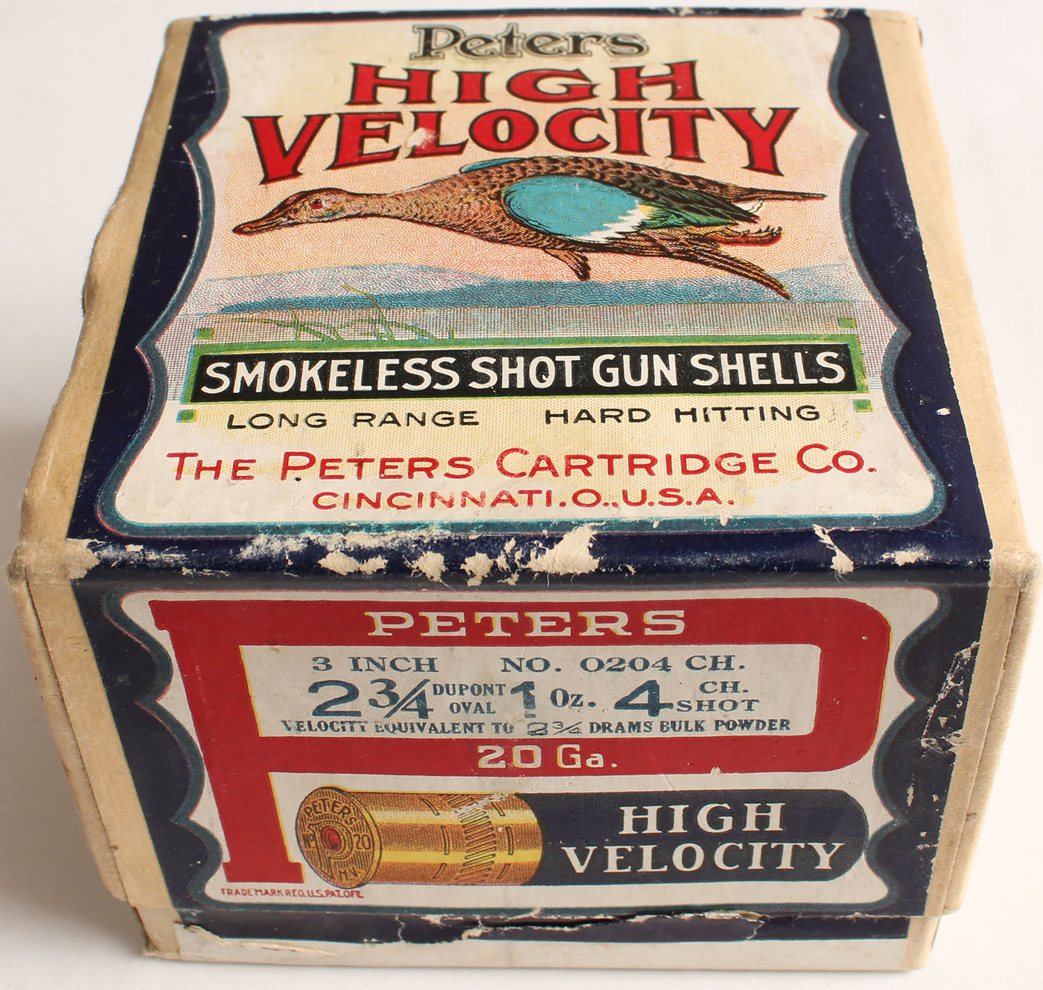 Peters Cart. Co., Blue Wing Teal, 20ga., 3'', 2pc., Full, shot size 4 CH, buff box with multi colored label that pictures Blue Wing Teal in flight, box is solid with great label, box has light scuffing & small shell protrusions, Shells are very good. Grade: Excellent + - Value: 200 to 600
