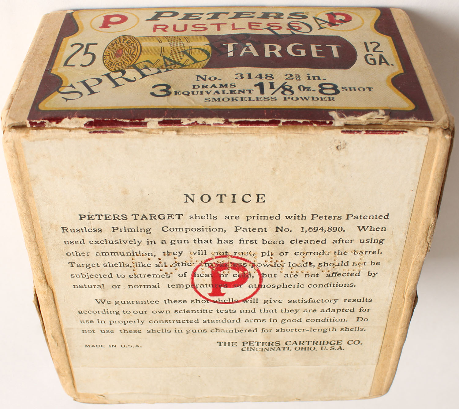 Peters Cart. Co., TARGET, OVER STAMPED ''SPREADER LOAD'', 12ga., 2 5/8'', 2pc., Empty, shot size 8 Shot., buff box with multi-colored label with Covey of Quail in the grass, box is solid & label shows age soiling, box has light edge wear & small tear, Cincinnati, O, U.S.A., Grade: Excellent - Value: 150 to 500