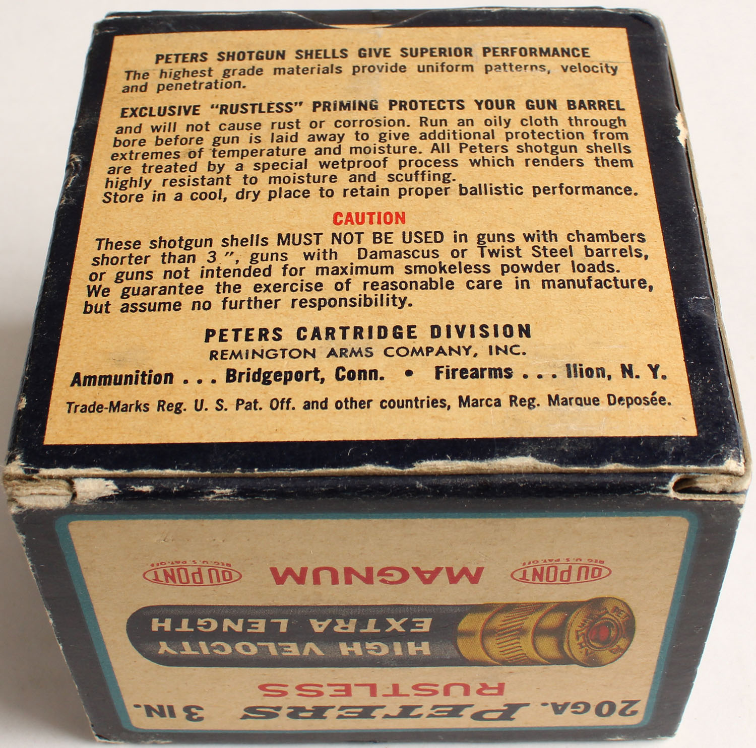 Peters Cart. Div., High Velocity, Extra Length Magnum, 20ga., 3'', 1pc., Full, shot size 4, multi colored box that pictures mallard flying out of the marsh grass, box has light edge wear with great colors, shells are excellent. Grade: Excellent - Value: 30 to 150