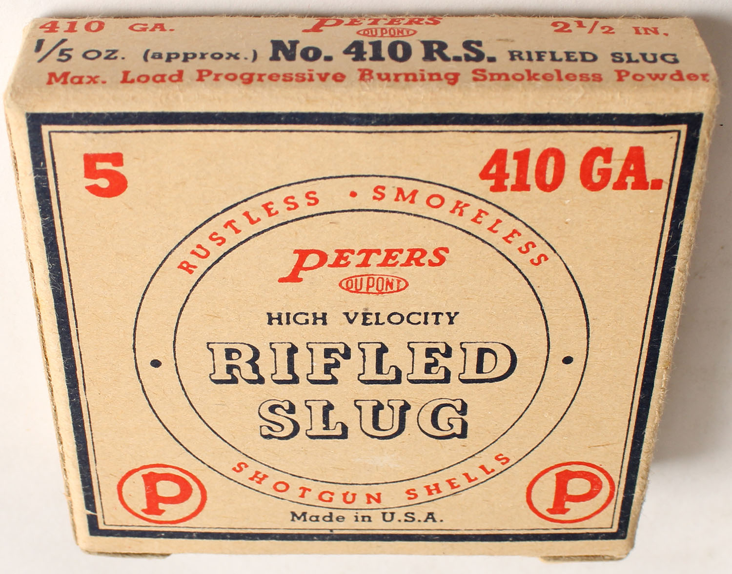 Peters Cart. Div., 410ga., 2 1/2'', 1pc., Full, shot size Rifled Slug , blue, orange & buff colored box, box is very solid with great colors, shells are excellent. Grade: Excellent + - Value: 10 to 40