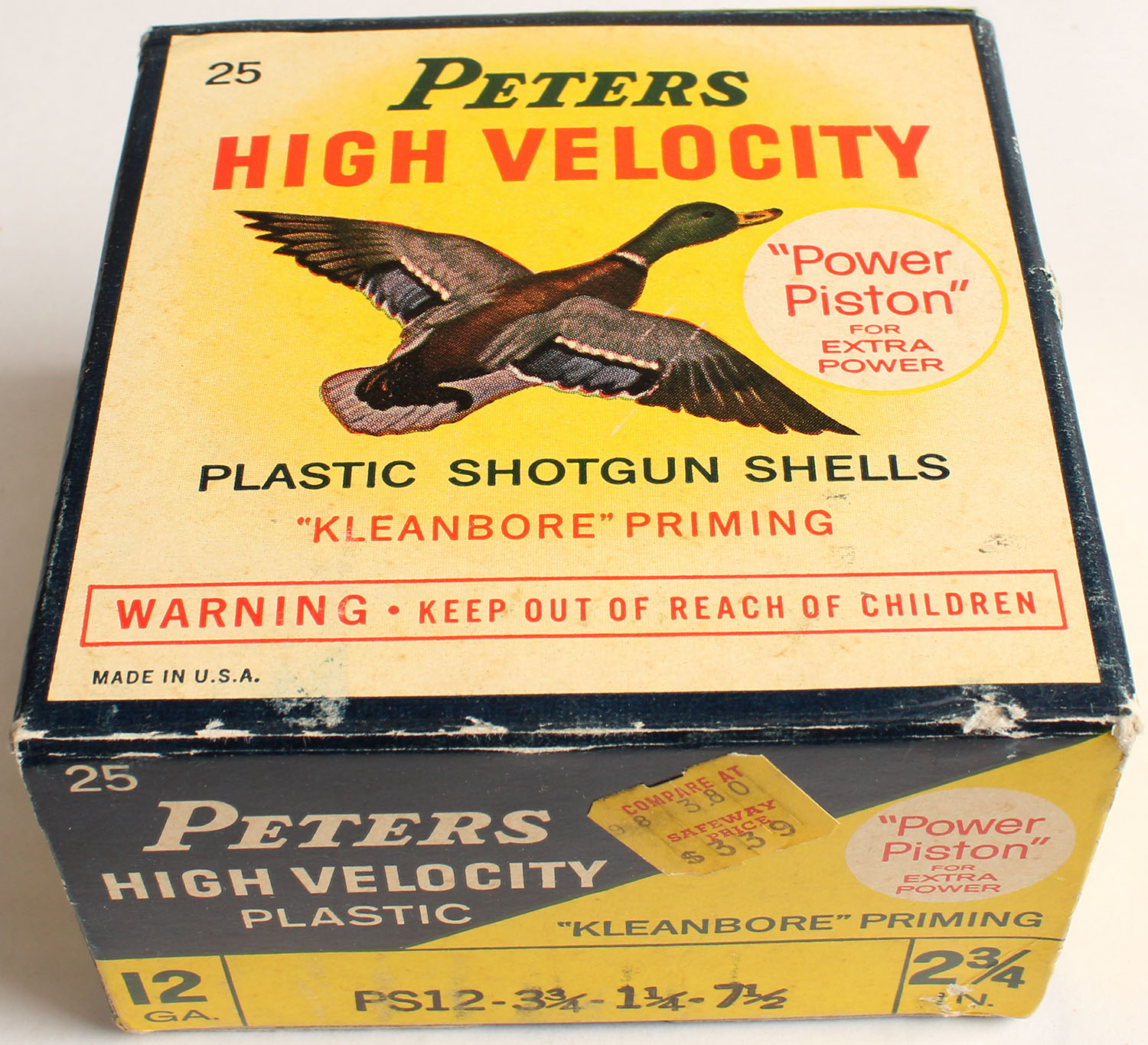 Peters Cart. Div., High Velocity, 12ga., 2 3/4'', 1pc., Full, shot size 7 1/2, multi colored box that pictures mallard flying, box is very solid with great colors, shells are excellent. Grade: Excellent - Value: 10 to 40
