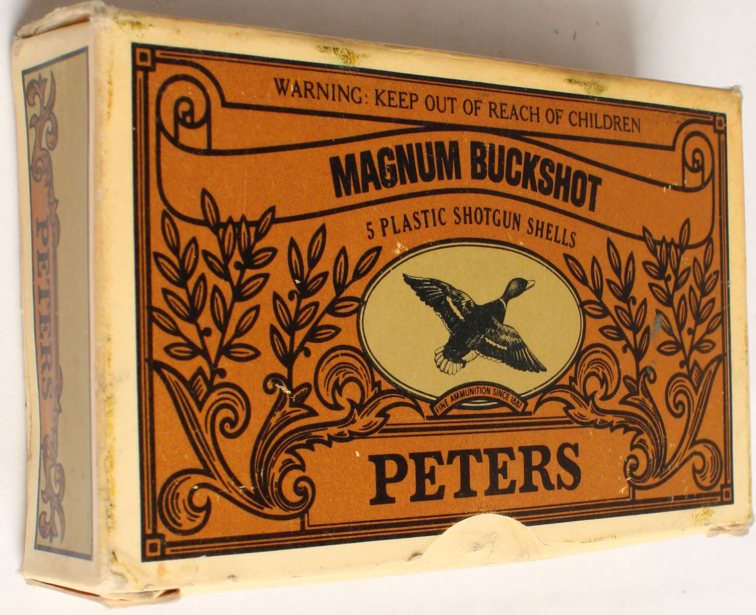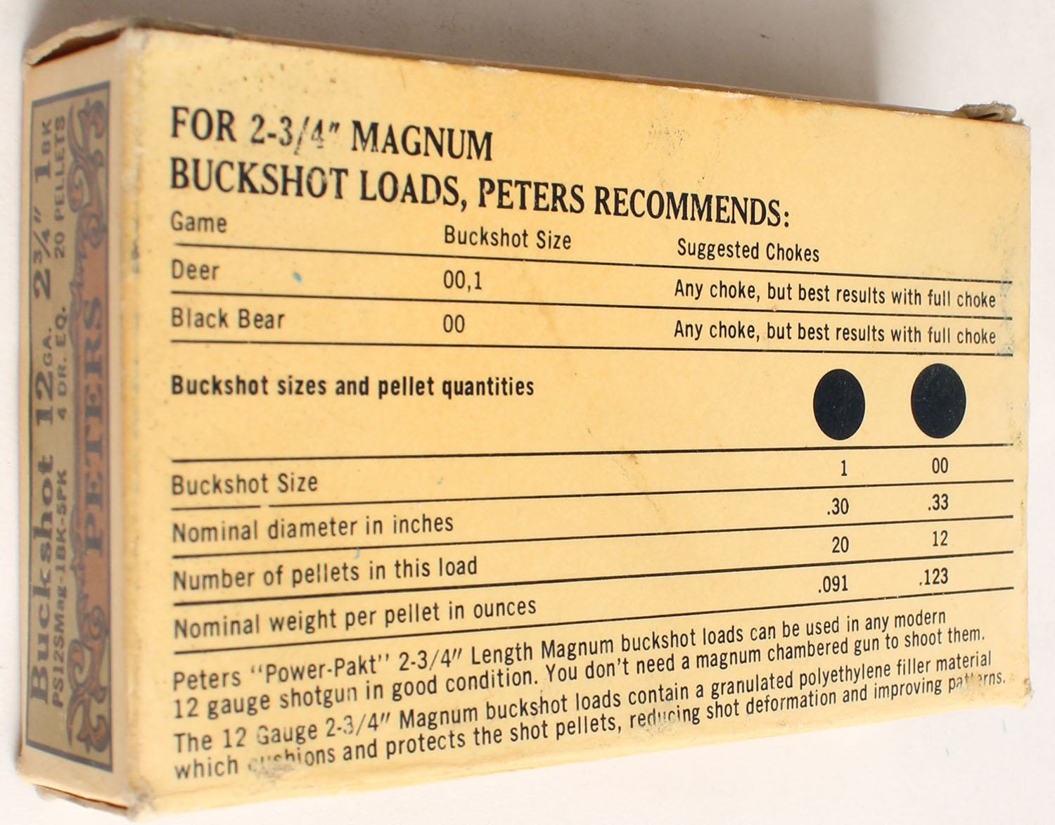 Peters Cart. Div., 12ga., 2 3/4'', 1pc., Full, shot size 1 Buck, 20 Pellets, multi colored box, box has very nice colors, shells are excellent. Grade: Excellent - Value: 6 to 20