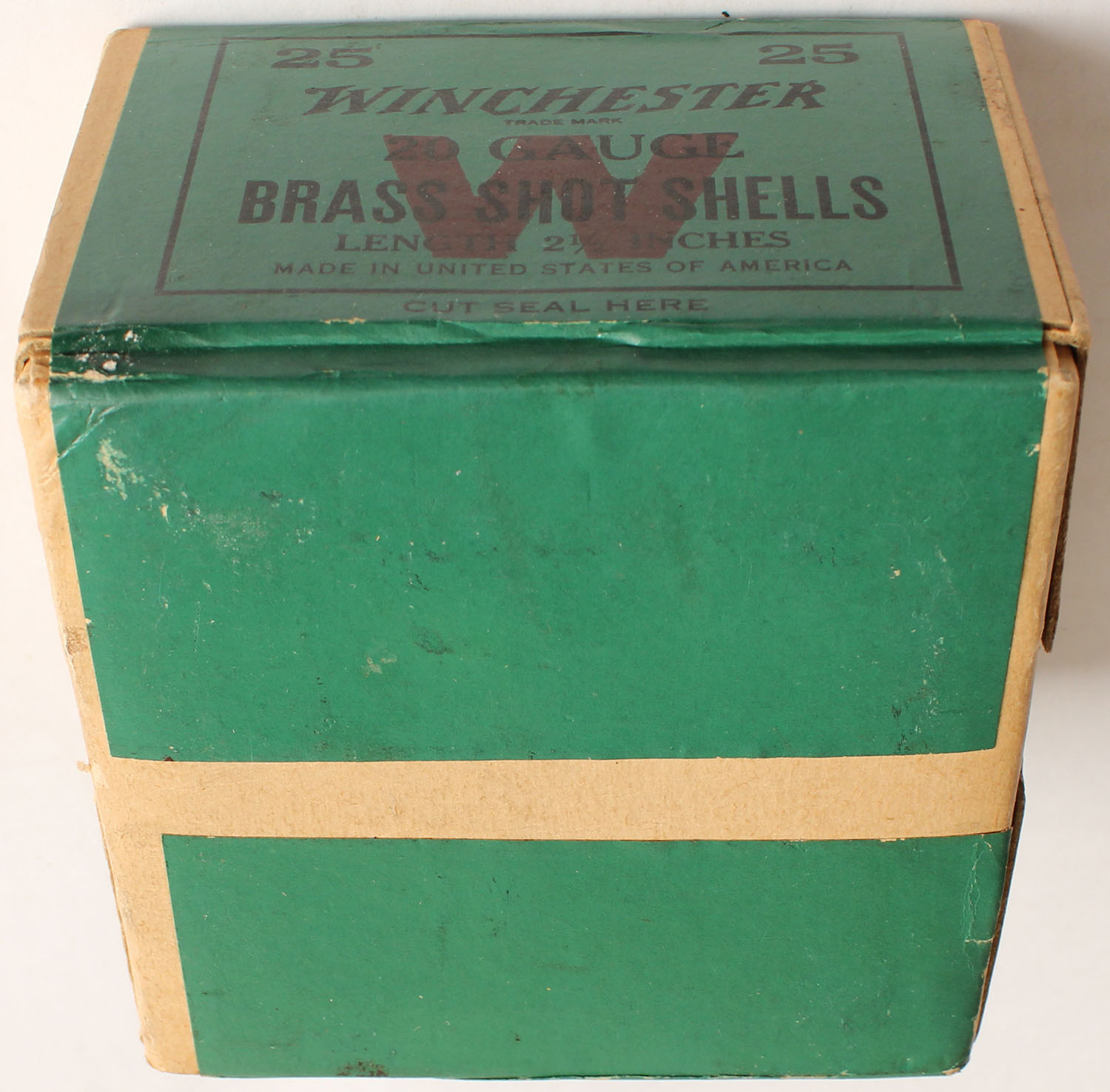 Winchester, BRASS SHOT SHELLS, 20ga., 2pc., 2 1/2'', FULL & SEALED, buff box with green, red & black label, box is very solid with Minty colors to label. Grade: Excellent ++ - Value: 200 to 600