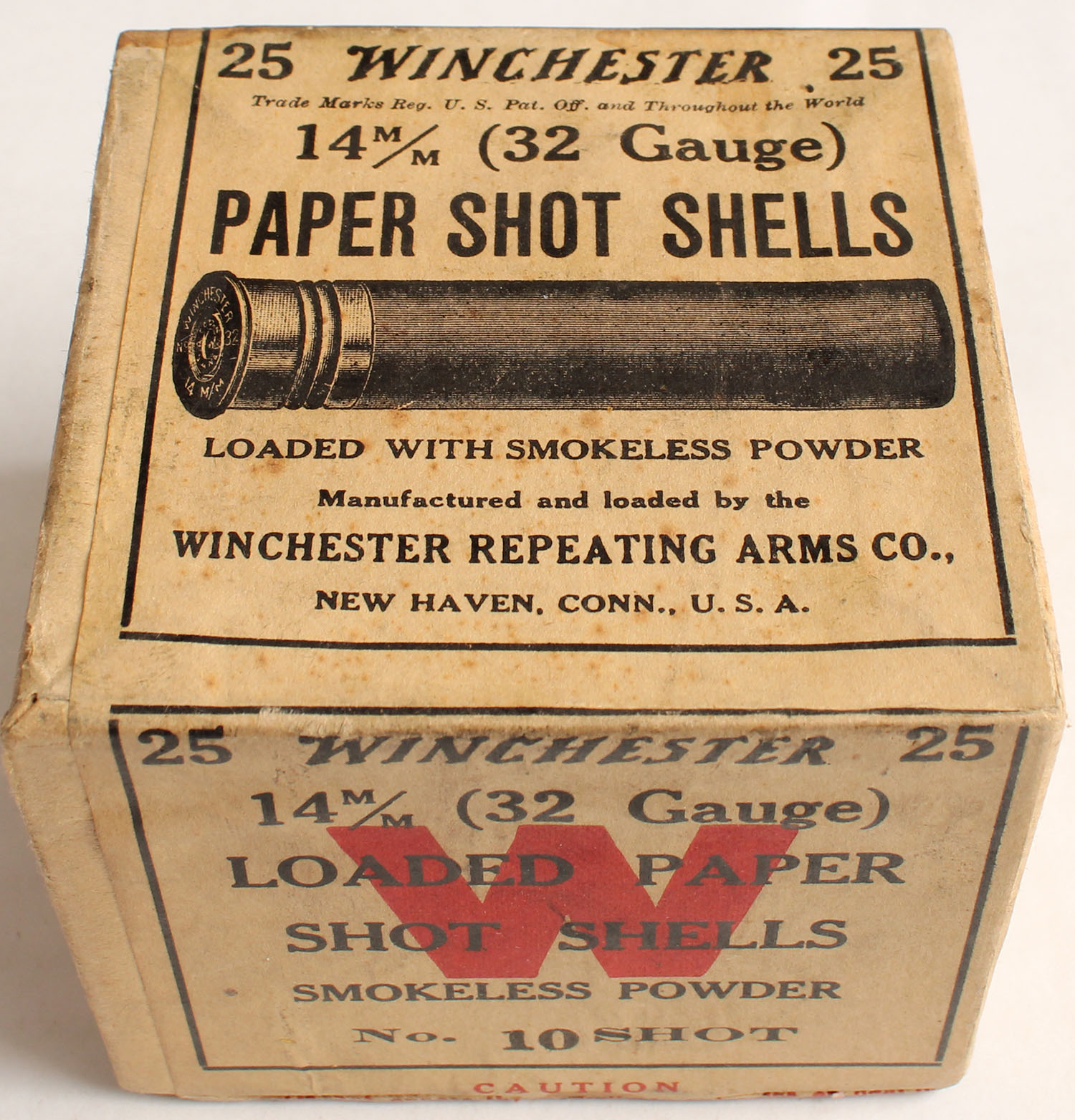 RARE Winchester, 32 GAUGE! 14m/m (32 Gauge), 2pc., FULL & Half SEALED, PAPER SHOT SHELLS, shot size 10, buff box with buff, red & black label, box is solid with nice colors, box has scuffing & soiling, VERY RARE & HARD TO FIND IN 32 GAUGE. Grade: Very Good ++ - Value: 150 to 800
