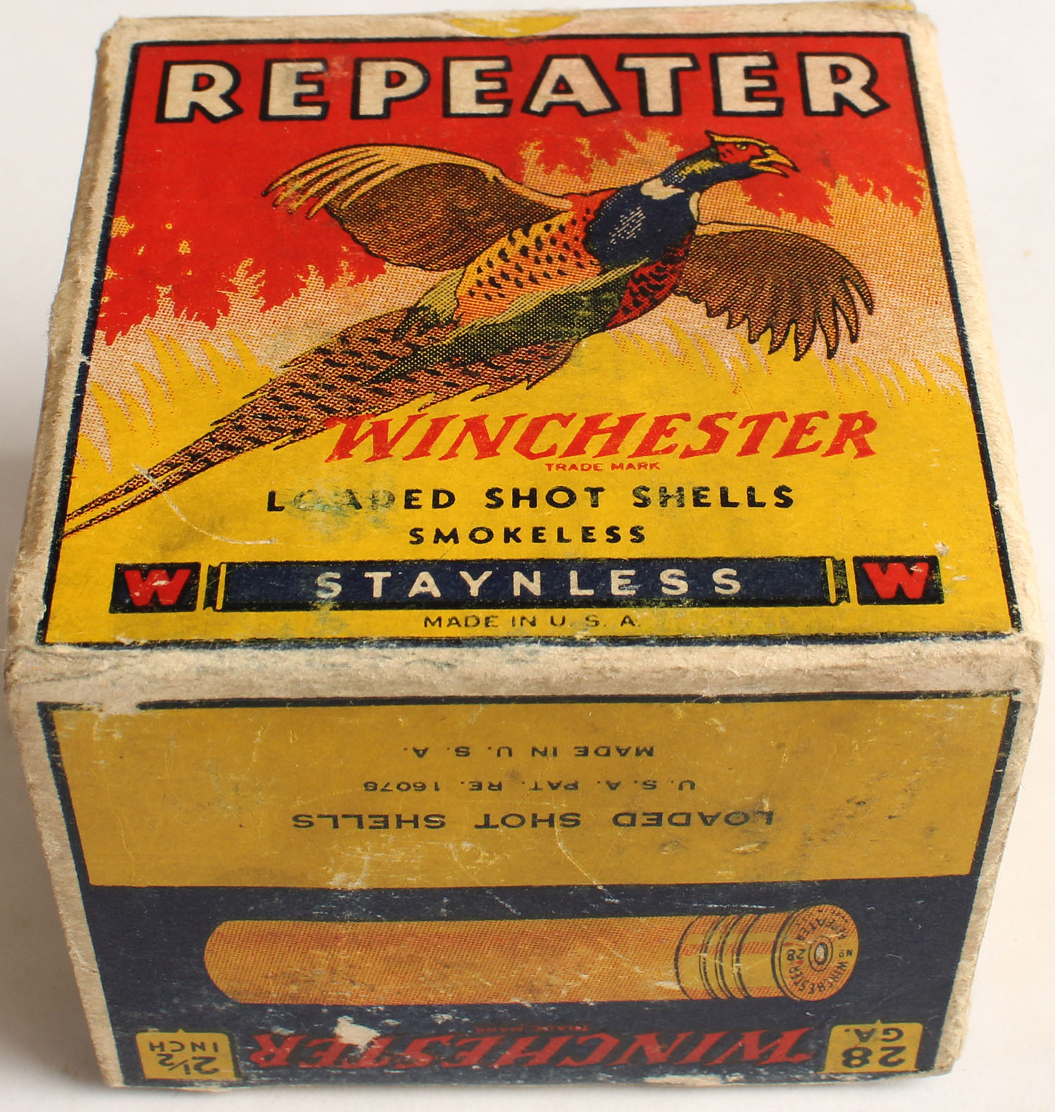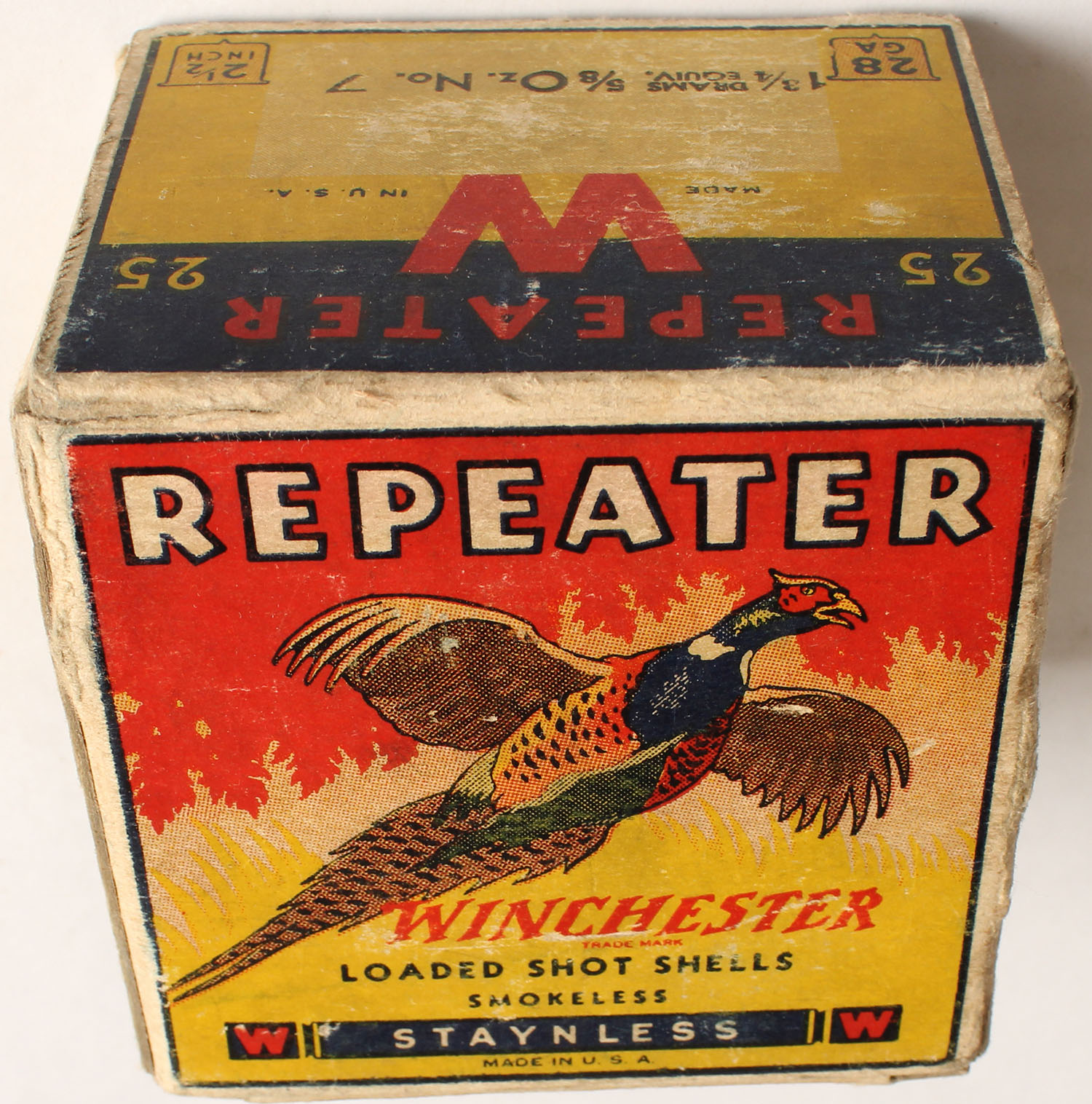 VERY RARE Winchester, PHEASANT BOX, REPEATER, 28 GAUGE, 1pc., FULL, Multi-colored PHEASANT BOX!!! Loading: 1 3/4 Drams - 5/8 Oz. - 7 Shot, 2 1/2'', box is solid with light scuffing & light edge wear, box has very nice colors, shells are excellent, HARD TO FIND BOX! Grade: Very Good ++ - Value: 1000 to 6000
