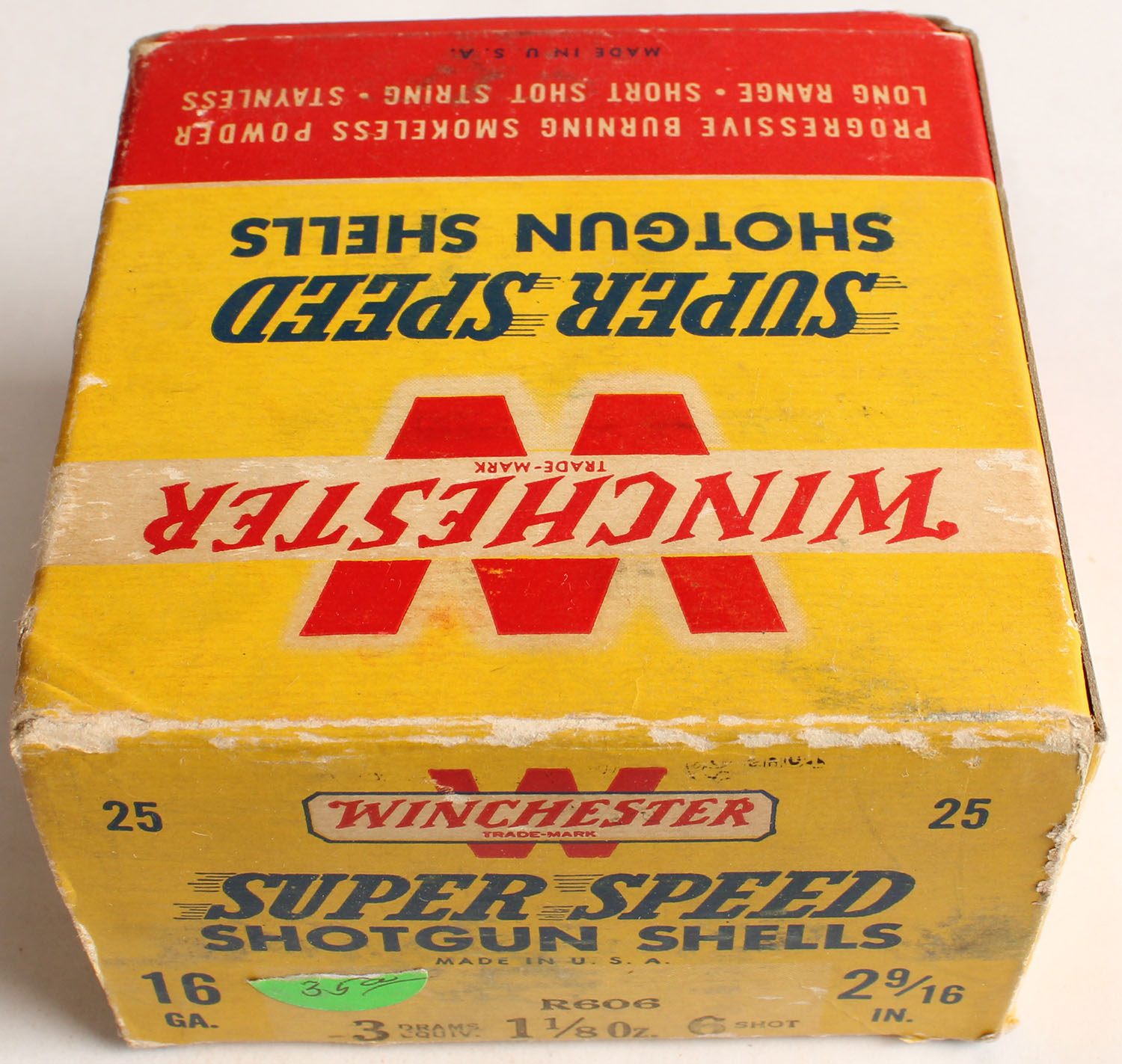 Winchester, Super Speed, 16ga., 2 9/16'', 1pc., Full, shot size 6, red, black and yellow box, box has light edge wear, light soiling & scuffing with very nice colors, shells are good but swollen. Grade: Very Good ++ - Value: 10 to 40