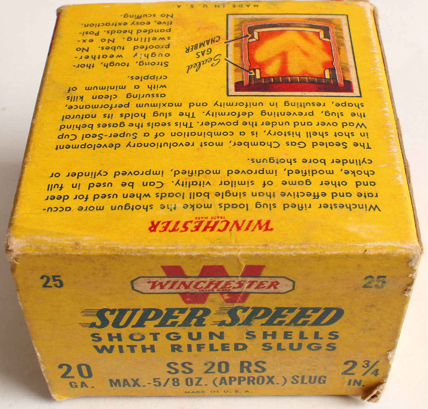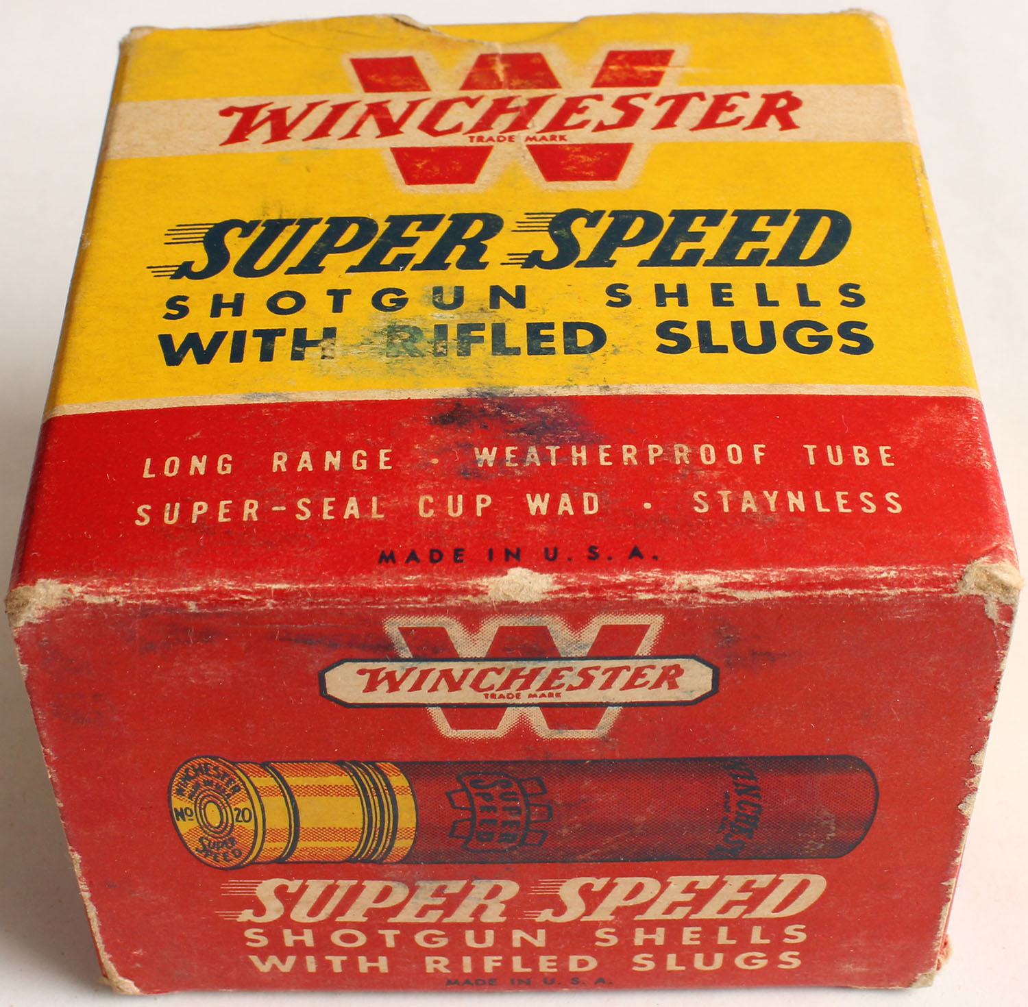 Winchester, Super Speed, 20ga., 2 3/4'', 1pc., Partial 11rds with 6rds being correct, shot size Rifled 5/8 Oz. Slug, red, black and yellow box, box has light edge wear & light soiling with very nice colors, shells are good. Grade: Very Good ++ - Value: 10 to 40