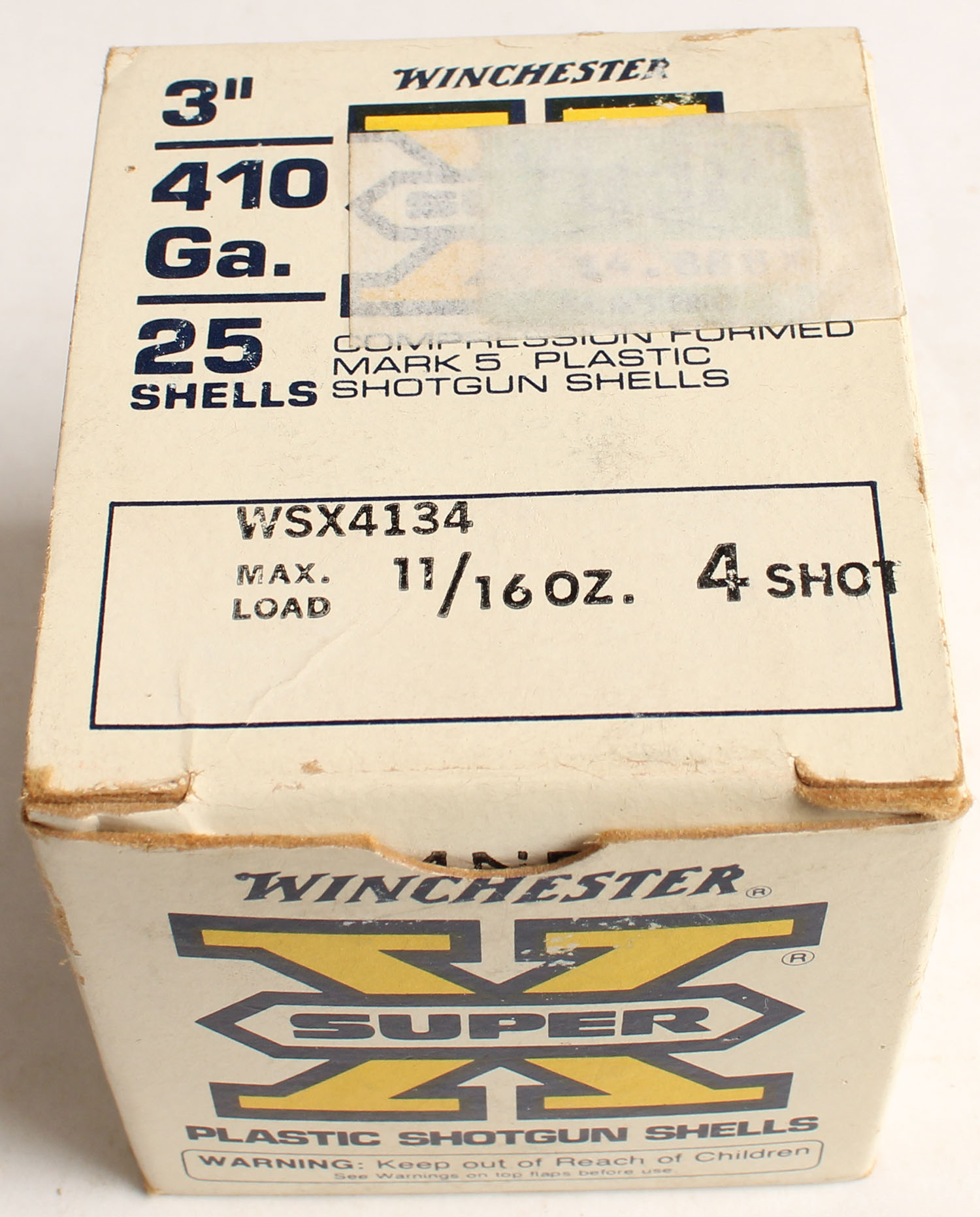 Winchester, Super X, 410ga., 2 3/4'', 1pc., Partial 24rds, shot size 4, multi-colored box, box has light edge wear & light scuffing with very nice colors, shells are very good. Grade: Very Good ++ - Value: 10 to 30