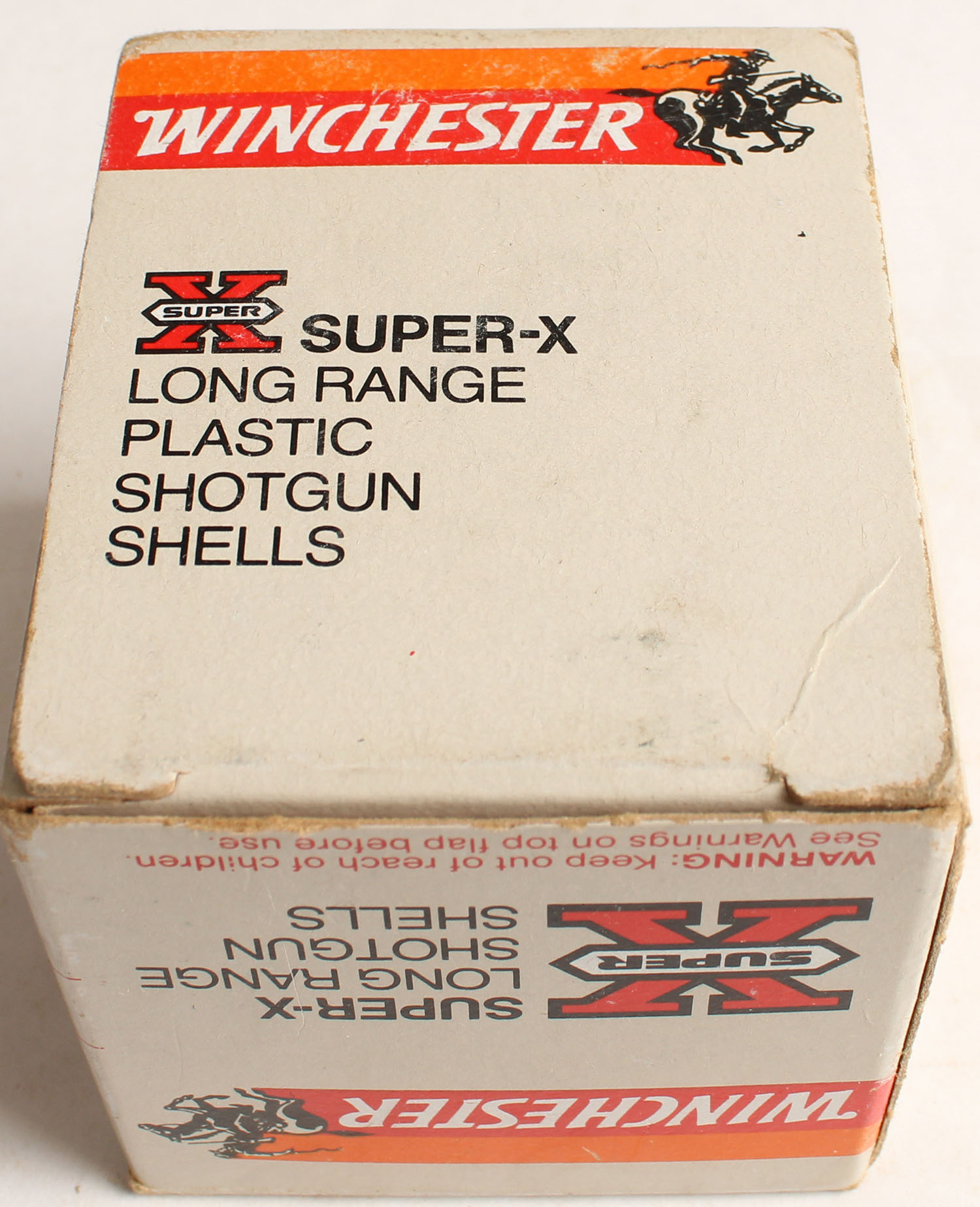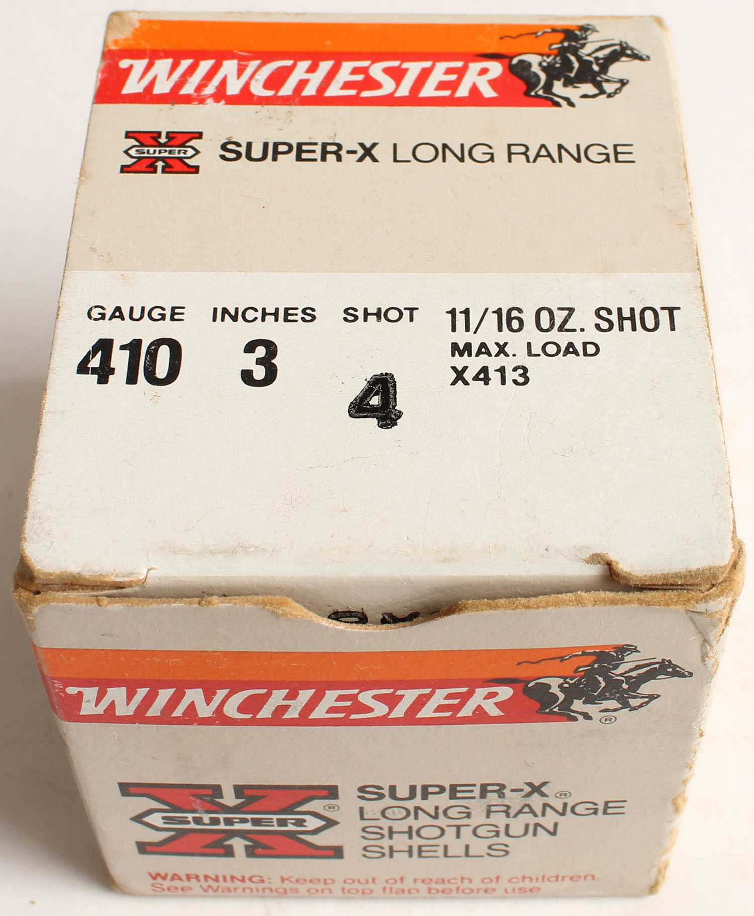 Winchester, Super X, 410ga., 3'', 1pc., Full with 5rds being incorrect shot size, shot size 4, multi-colored box, box is solid with light edge wear & very good colors, shells are excellent. Grade: Very Good ++ - Value: 10 to 40