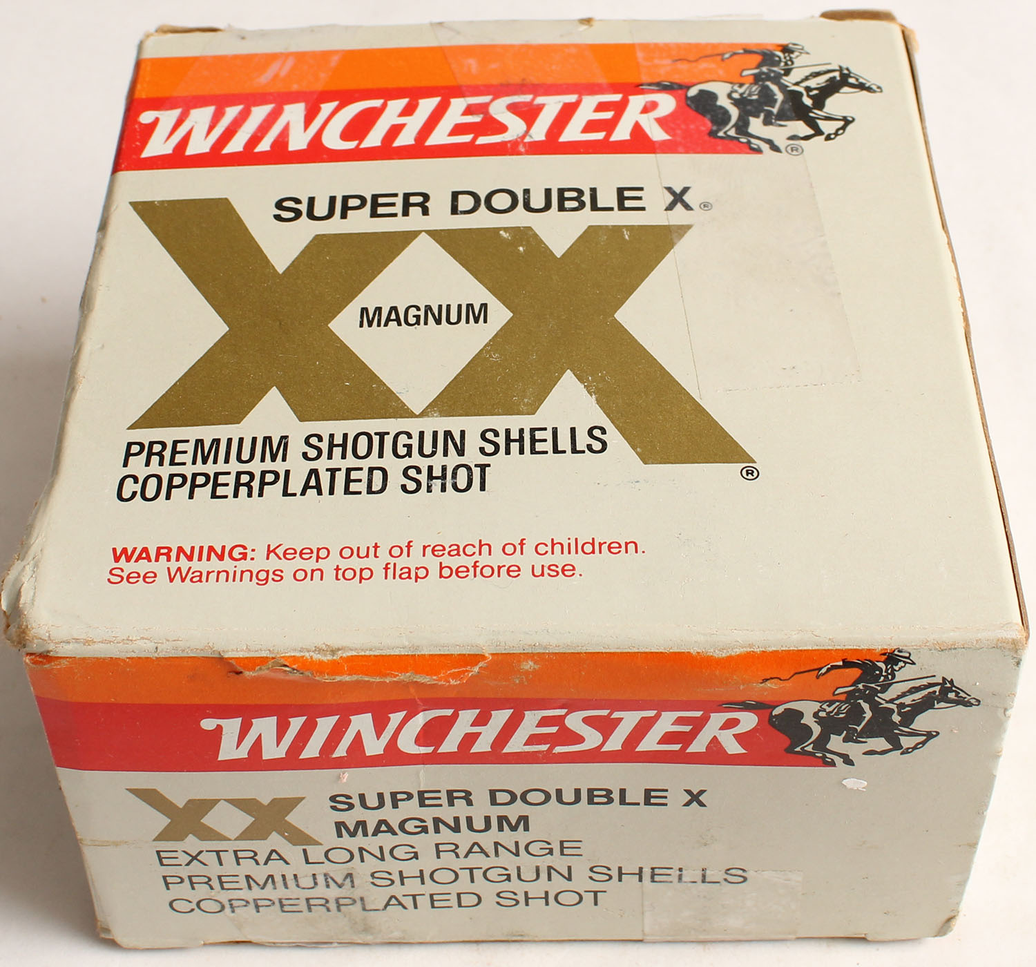 Winchester, Super Double X Magnum, 12ga., 3'', 1pc., Full, shot size BB, multi-colored box, box has seam split, edge wear & scuffing with good colors, shells are very good. Grade: Very Good + - Value: 10 to 30