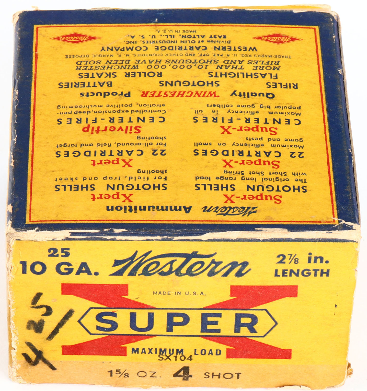 Western, Super X with Insert, 10ga., 1pc., Partial 24rds., shot size 4, 2 7/8'', multi-colored box, box has age soiling & edge wear with nice color, shells are excellent. Grade: Very Good ++ - Value: 10 to 30