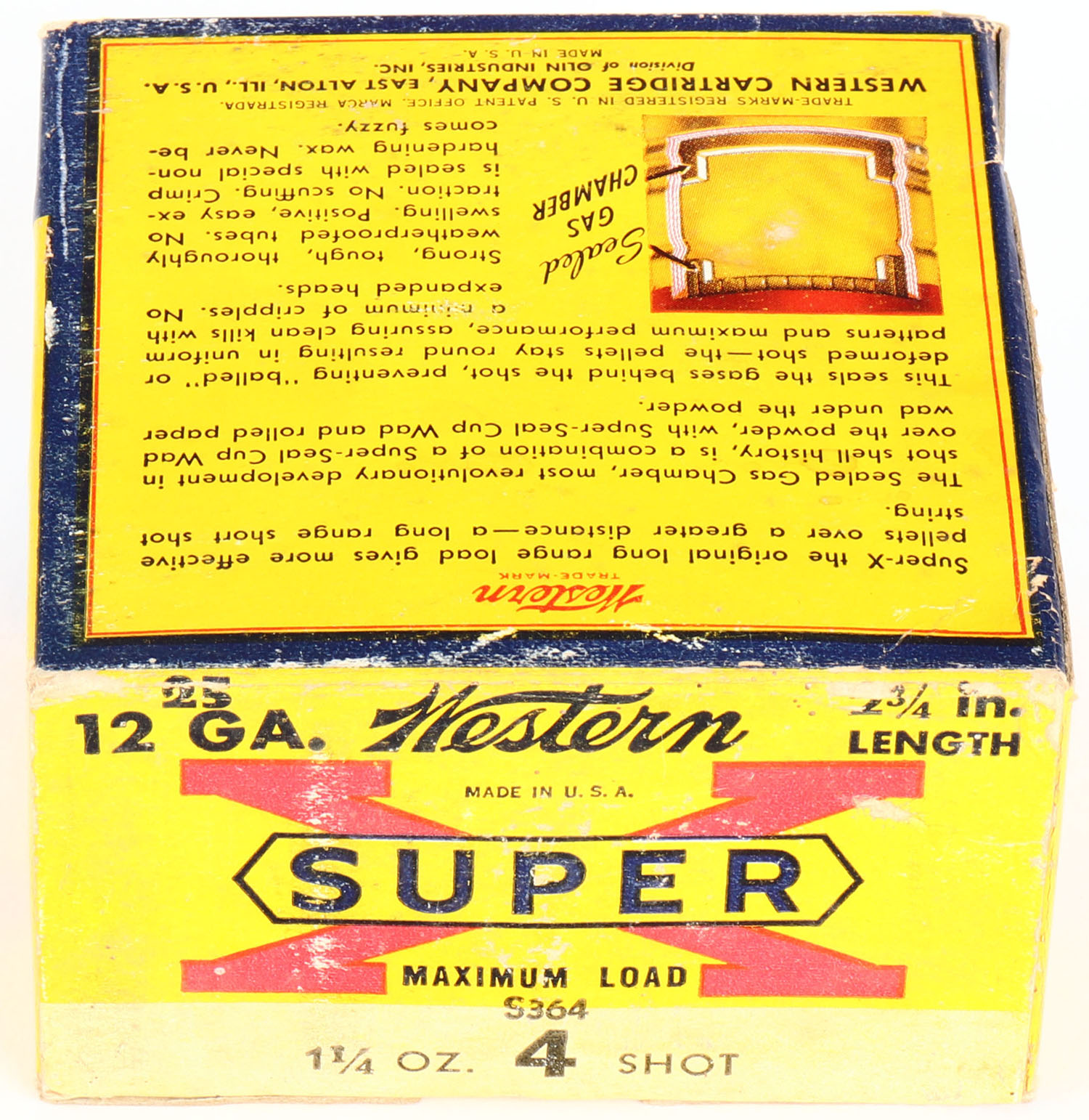 Western, Super X, 12ga., 1pc., Full, shot size 4, 2 3/4'', multi-colored box, box has light scuffing with great color, shells are excellent. Grade: Excellent - Value: 10 to 30