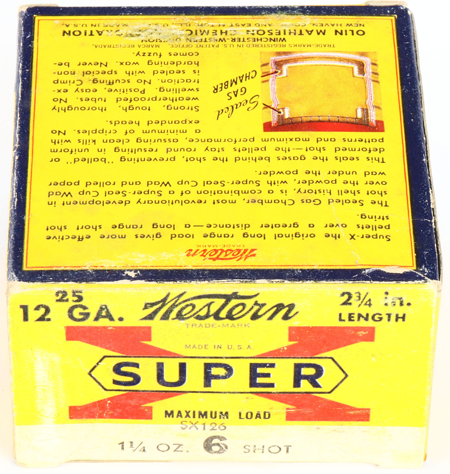 Western, Super X, 12ga., 1pc., Full with all rds being incorrect shot size, shot size 6, 2 3/4'', multi-colored box, box has light soiling with very nice color, shells are excellent. Grade: Excellent - Value: 10 to 30