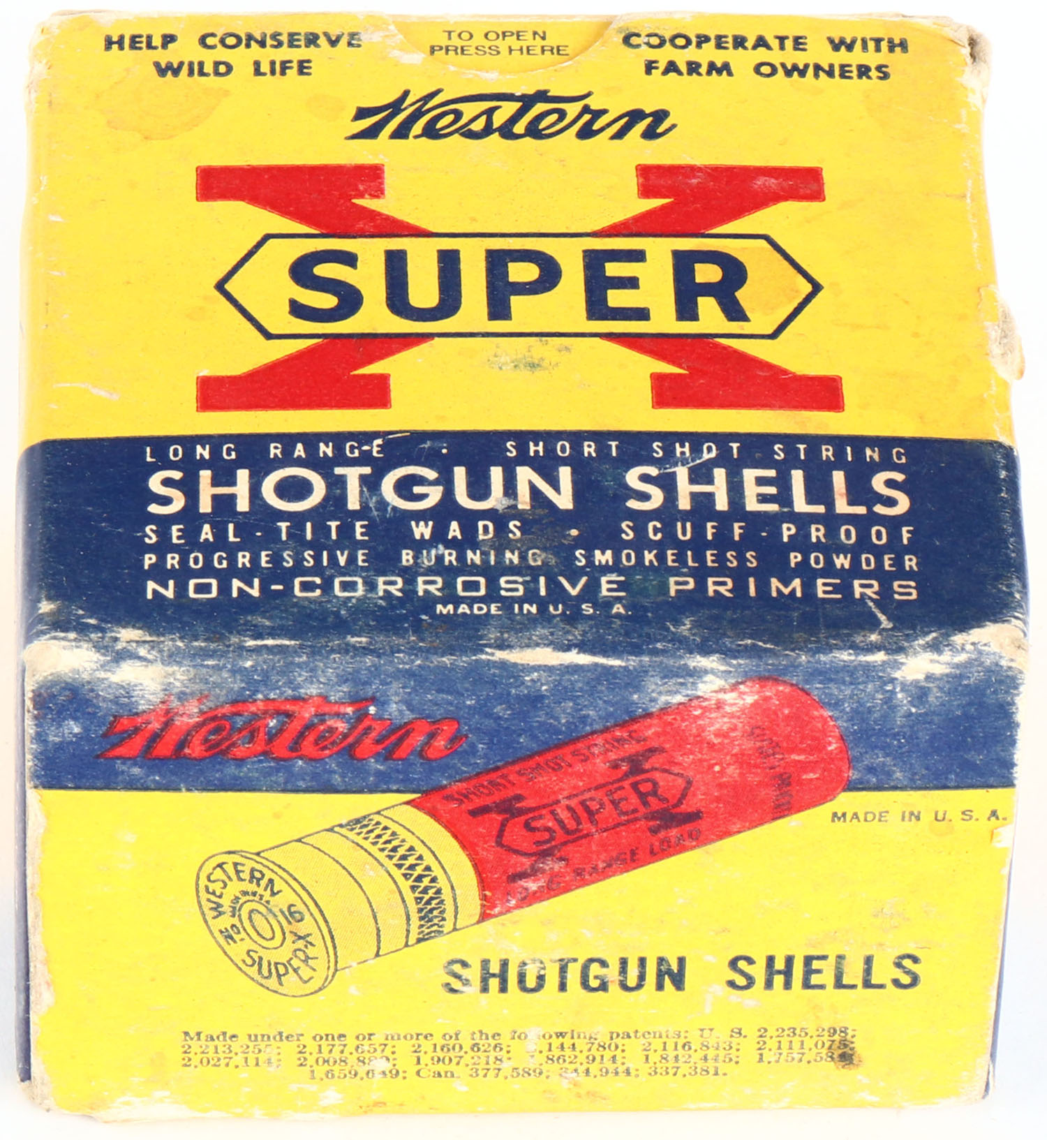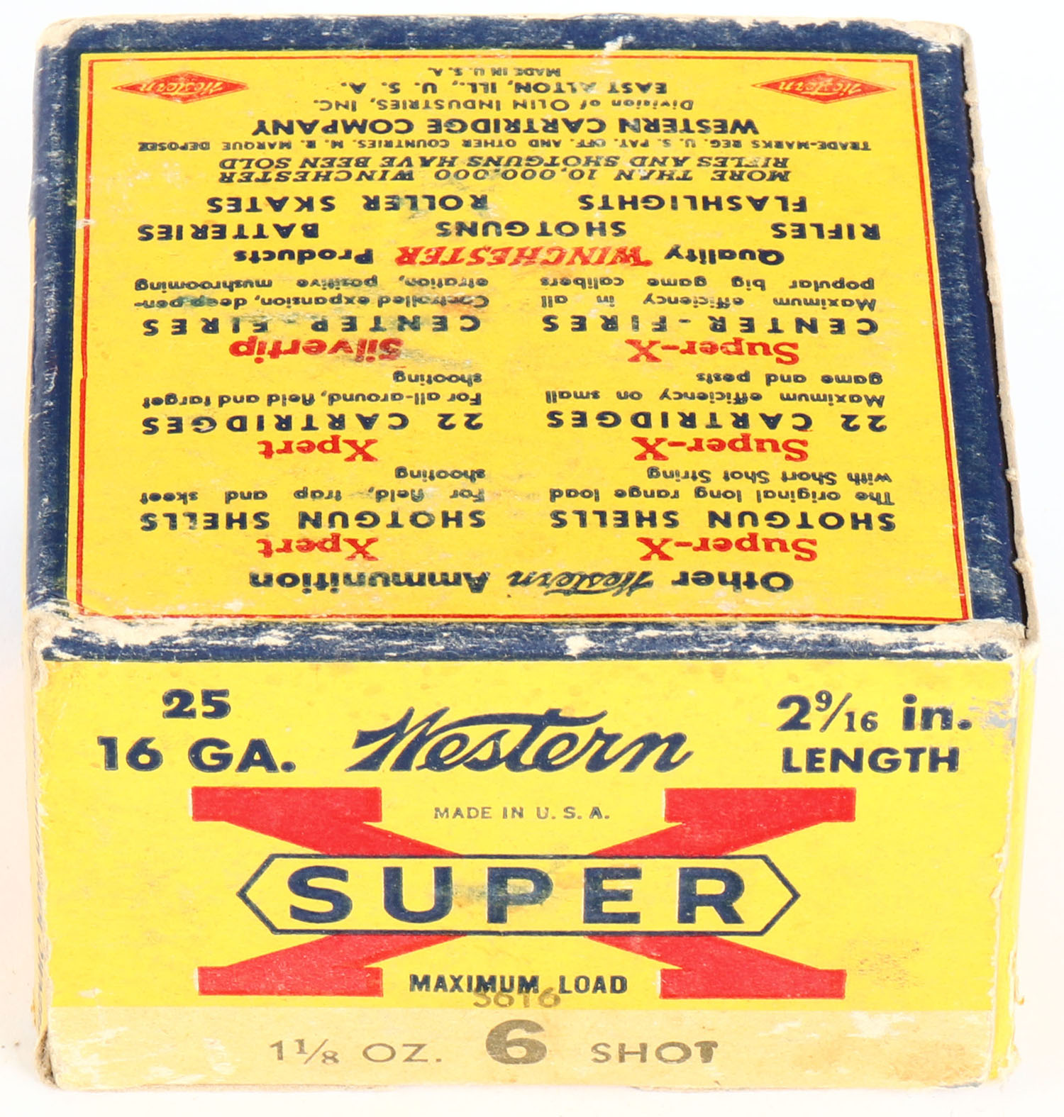 Western, Super X, 16ga., 1pc., Partial 24rds., shot size 6, 2 9/16'', multi-colored box, box has soiling & edge wear with very nice color, shells are excellent. Grade: Very Good ++ - Value: 10 to 30