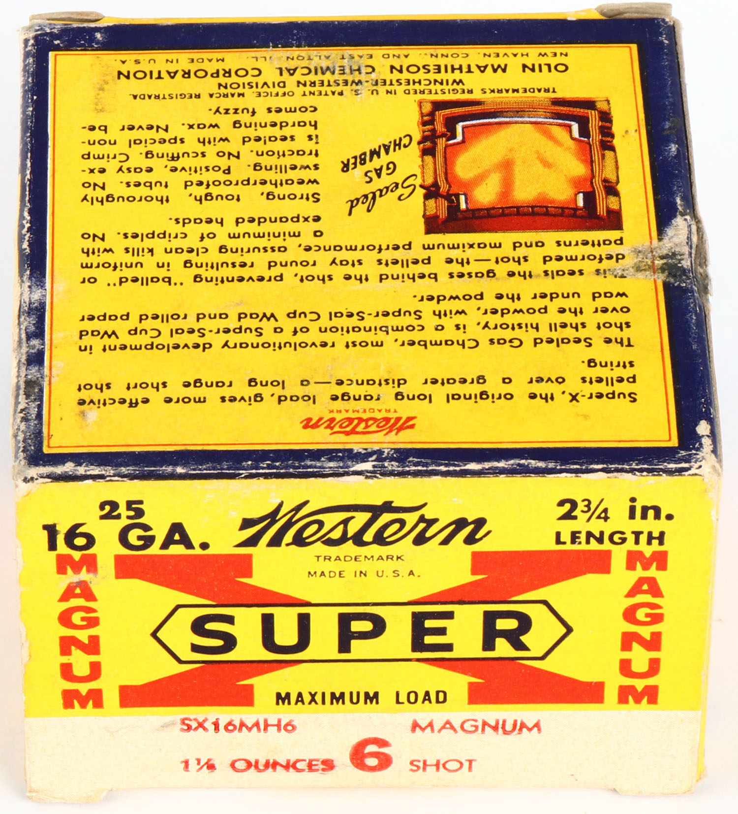 Western, Super X Magnum, with Insert, 16ga., 1pc., Full, shot size 6, 2 3/4'', multi-colored box, box has edge wear & light soiling with very nice color, shells are excellent. Grade: Very Good ++ - Value: 10 to 30