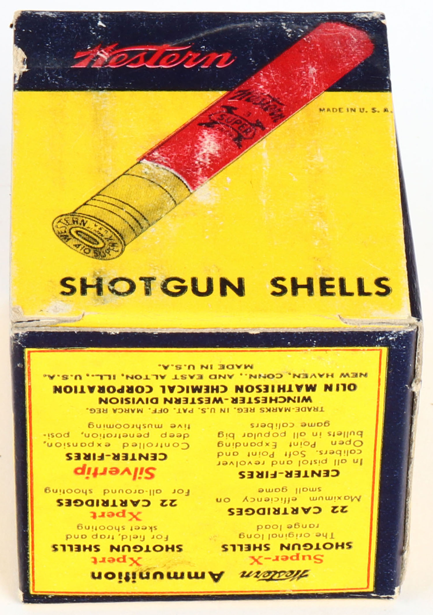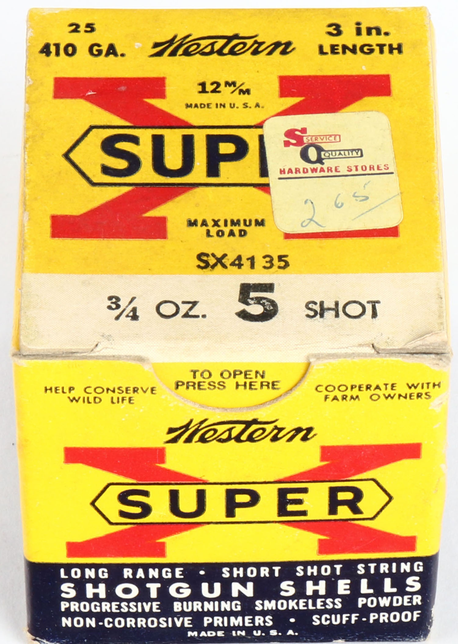 Western, Super X with Insert, 410ga., 1pc., Full, shot size 5, 3'', multi-colored box, box has light edge wear with great color, shells are excellent. Grade: Excellent - Value: 10 to 40