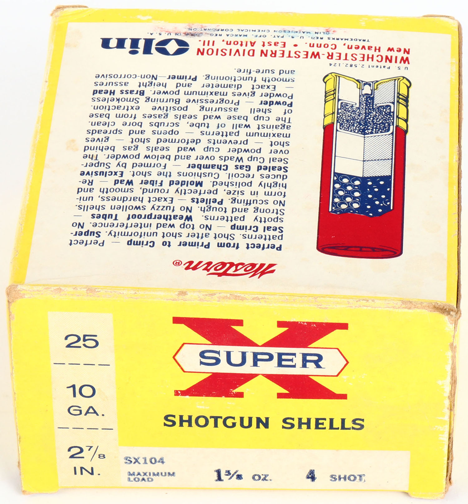 Western, Super X, 10ga., 1pc., Full, shot size 4, 2 7/8'', multi-colored box, box is solid with light soiling & very nice color, shells are excellent. Grade: Very Good ++ - Value: 10 to 40
