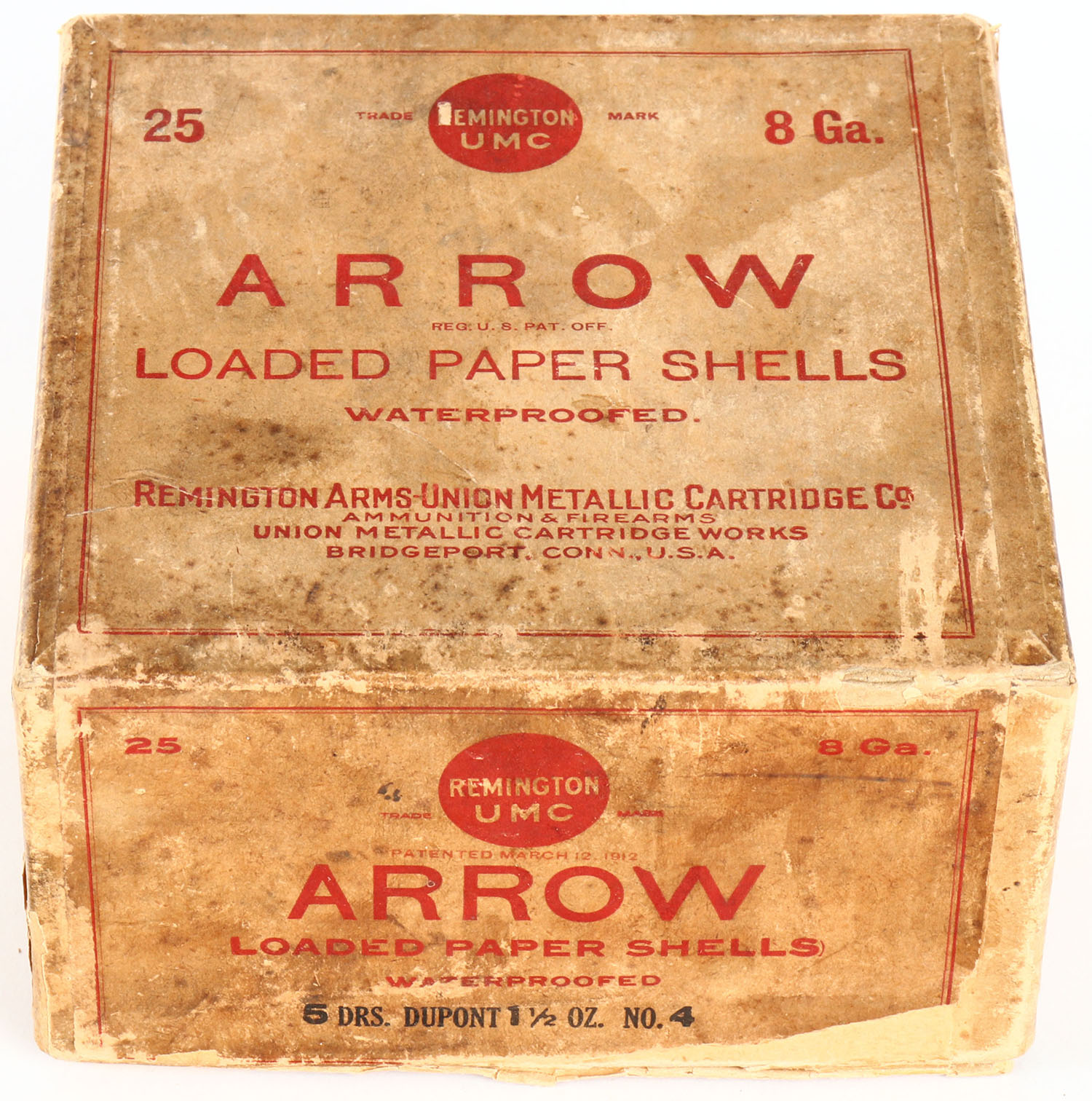 Remington UMC, ARROW, 8ga., 2pc., Full, Loading: 5 Drs. 1 1/2 Oz. No. 4, buff box with buff & red label, box & label are nice with age soiling, edge wear & light scuffing, Shells are very good. Grade: Very Good - Value: 100 to 600