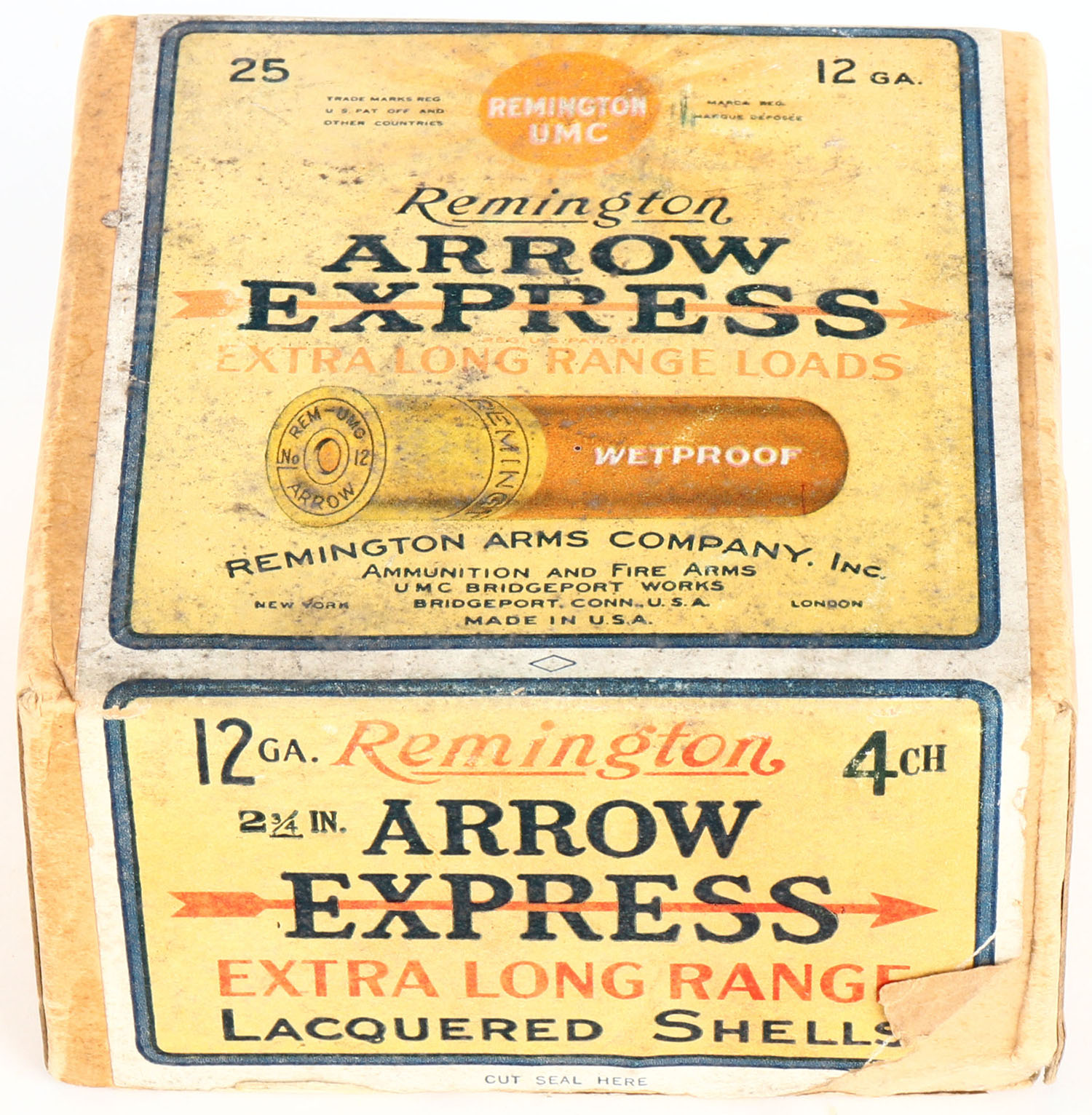 Remington UMC, Arrow Express, 12ga., 2 3/4'', 2pc., Empty, shot size 4CH, buff box with orange, blue & red label with shotshell on top & Sunburst logo, box has soiling & light scuffing to nice label. Grade: Very Good ++ - Value: 20 to 80