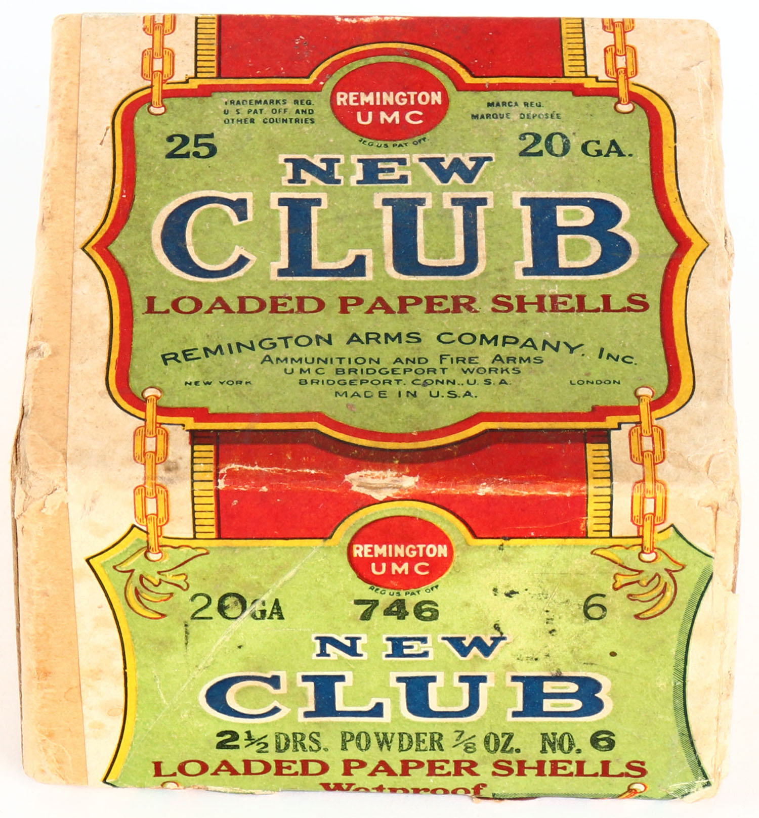 Remington UMC, New Club, 20ga, 2pc., FULL and SEALED, Loading: 2 1/2 Drs. 7/8 Oz. No. 6, buff box with green, yellow, blue & red paper label, box has light scuffing & light edge wear. Grade: Excellent - Value: 100 to 400