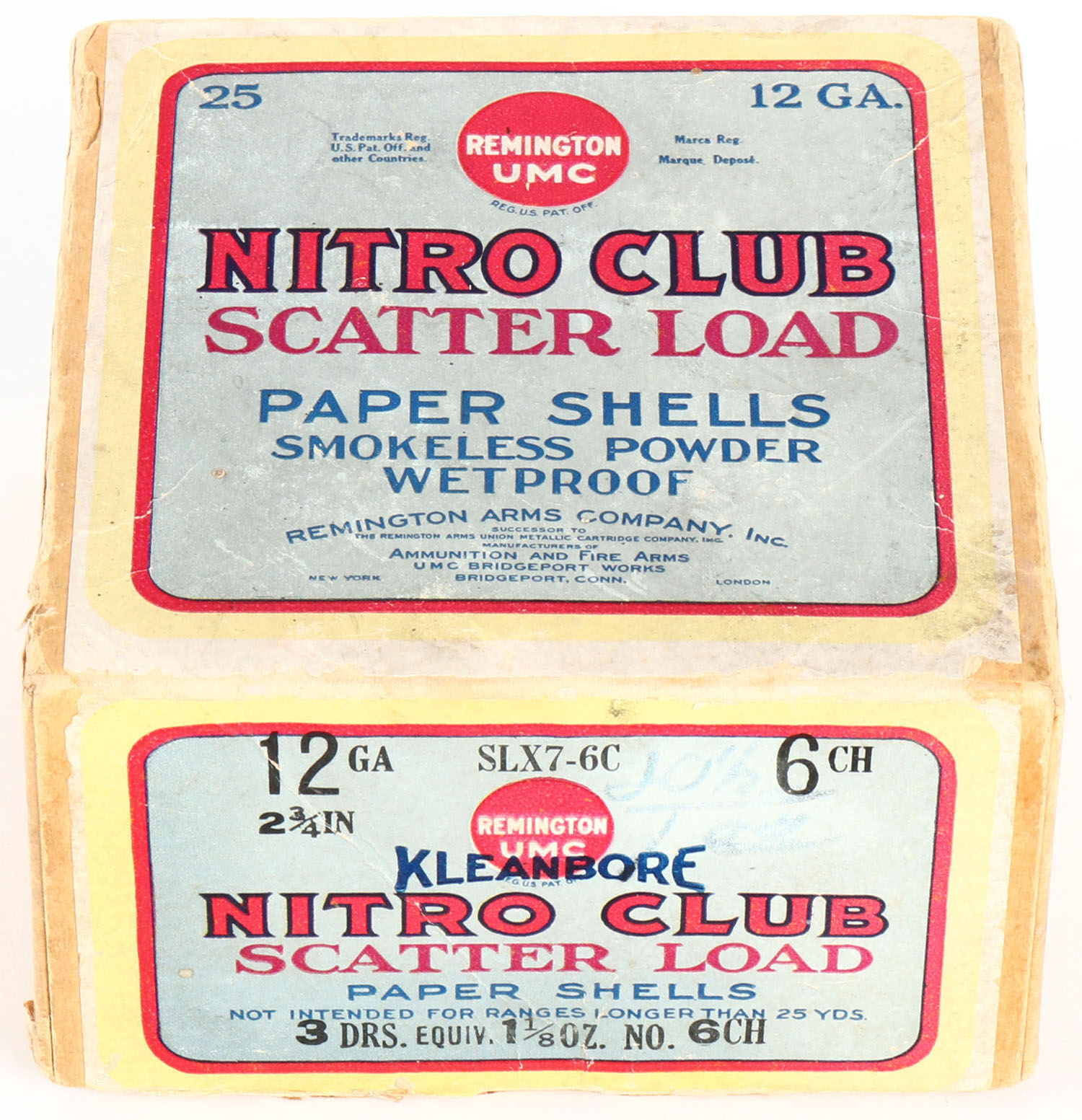 Remington U.M.C., Nitro Club Scatter Load, 12ga., 2 3/4'', 2pc., Empty, shot size 6CH, buff box with blue, yellow, and red colors, box is very solid with light soiling, seam split, light edge wear & very nice colors to label. Grade: Very Good ++ - Value: 60 to 300
