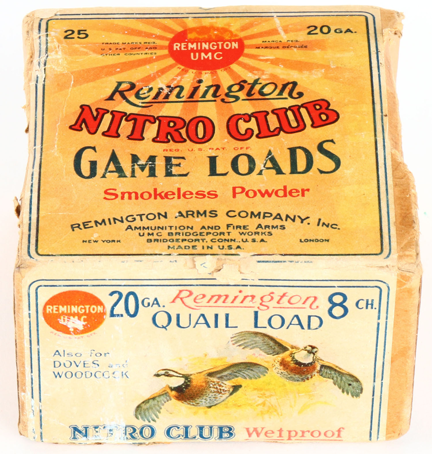 Remington UMC Nitro Club, GAME LOADS, QUAIL LOAD, 20ga., 2pc., Empty, shot size 8 CH, buff box with sunburst logo & two QUAIL in flight on side, box has seam splits, edge wear & tape repair with nice label. Grade: Very Good + - Value: 60 to 250