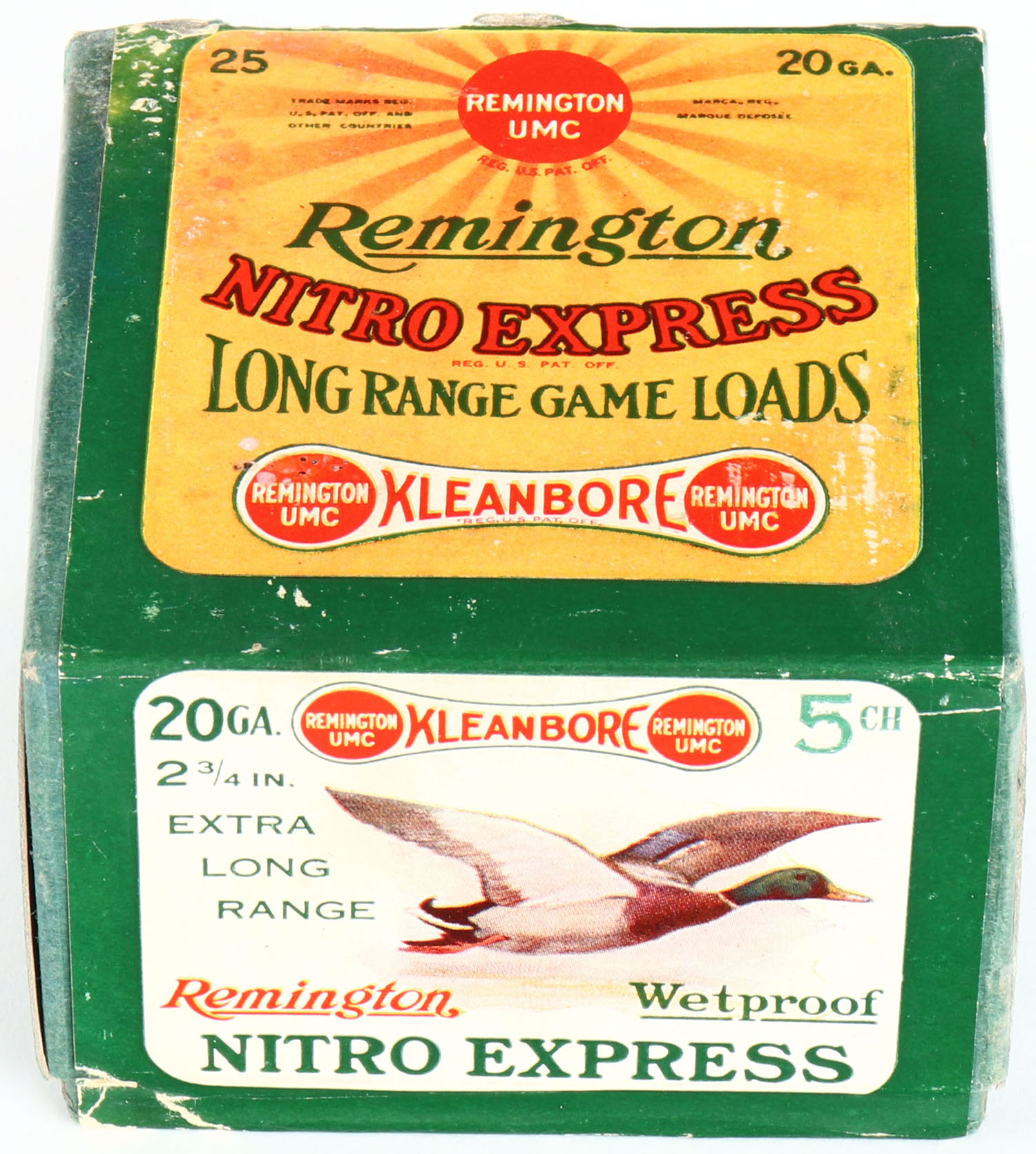 Remington Nitro Express, Long Range Game Loads, 20ga., 2 3/4'', 2pc., FULL & SEALED, shot size 5 CH, green box with sunburst logo & MALLARD in flight on side, box has shell protrusions, light edge wear & light scuffing with great colors. Grade: Very Good ++ - Value: 60 to 250
