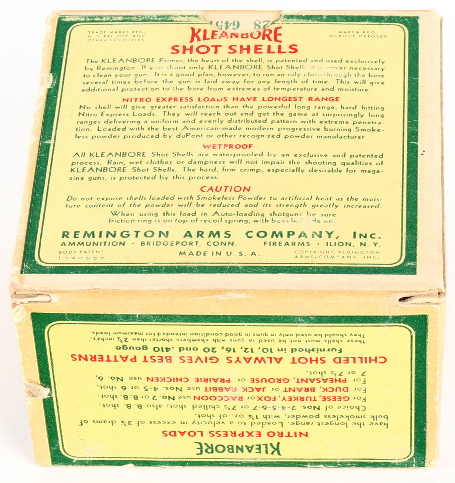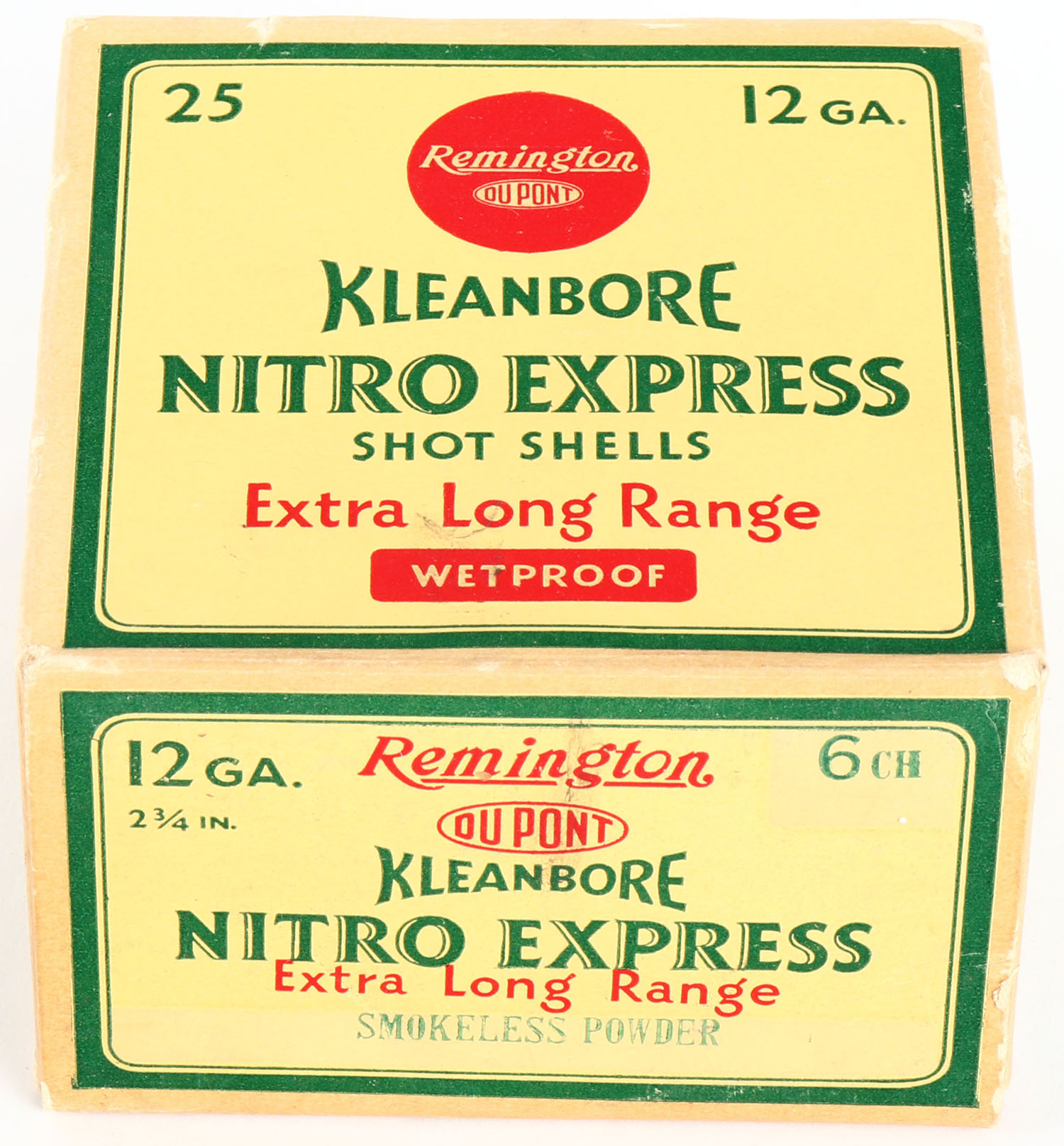 Remington, Kleanbore, NITRO EXPRESS, 12ga., 2 3/4'', 1pc., Full, shot size 6 CH, box is buff, yellow, red and green, box has edge wear with great colors, shells are excellent. Grade: Excellent - Value: 20 to 60