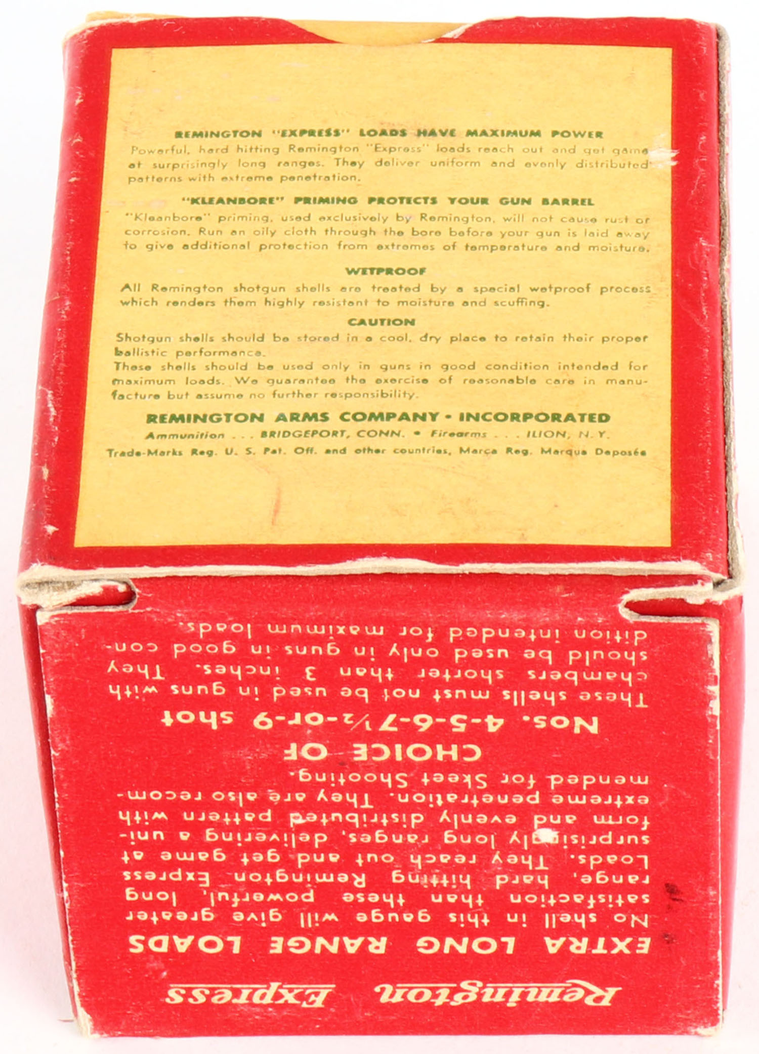 Remington Express, Extra Long Range, 410ga., 3'', 1pc., Full, shot size 7 1/2, box is white, yellow, red and green, box is very solid with very nice colors, shells are excellent. Grade: Excellent - Value: 10 to 50